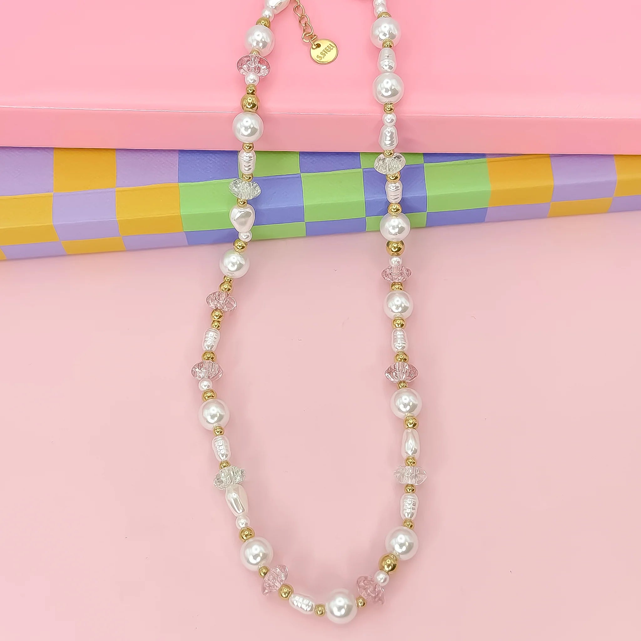 The Blush Belle Necklace artfully combines lustrous pearls with pale pink crystals and gold-toned accents in a sophisticated arrangement. The graduated pearl placement creates visual interest while the crystal elements add subtle sparkle. This versatile piece transitions effortlessly from daytime elegance to evening refinement, with a secure clasp ensuring comfortable wear throughout any occasion.