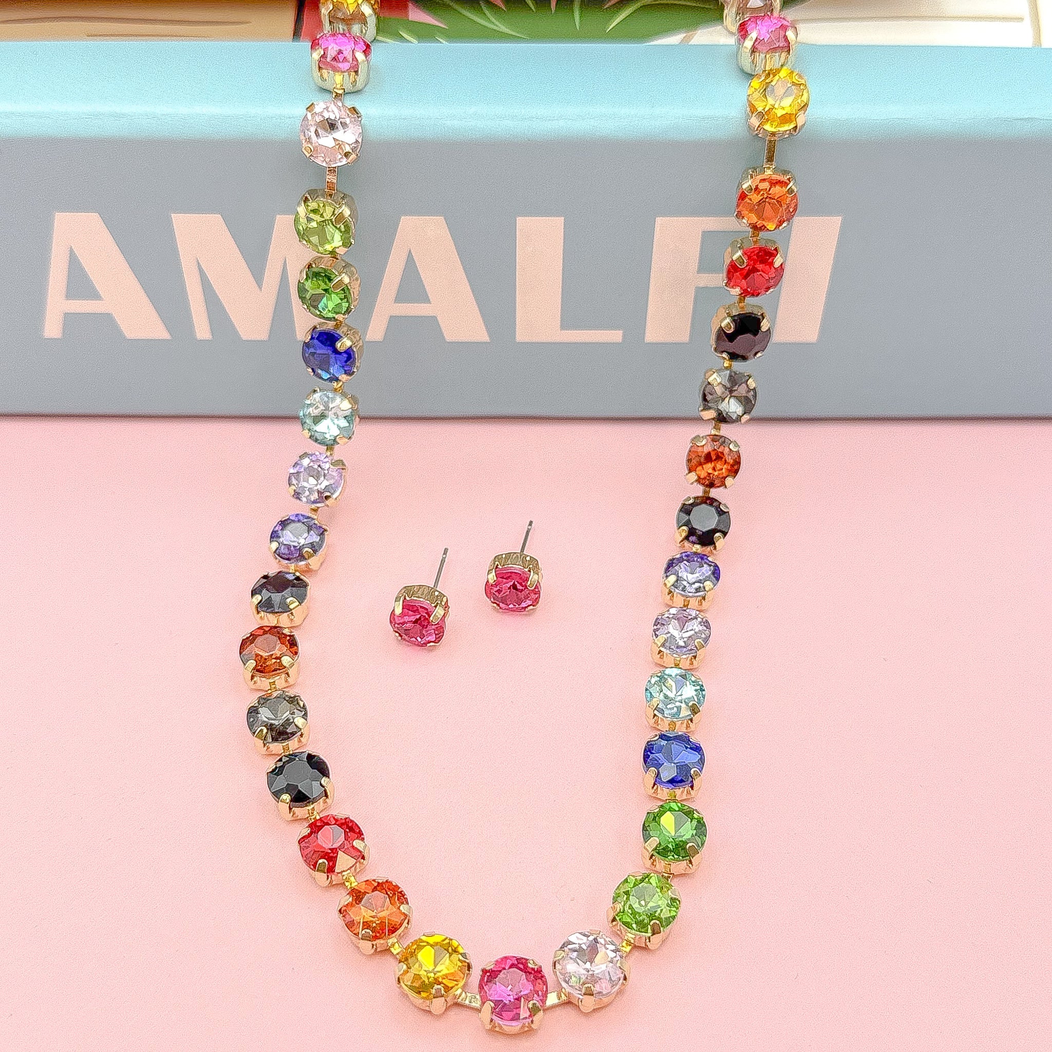 The Disco Skittles Necklace features a meticulously arranged spectrum of premium crystals that capture and reflect light with exceptional brilliance. This statement piece is complemented by matching stud earrings, creating a coordinated ensemble suitable for formal occasions or adding sophisticated flair to casual attire. The rainbow color palette offers versatile styling options while the durable construction ensures lasting quality through regular wear.