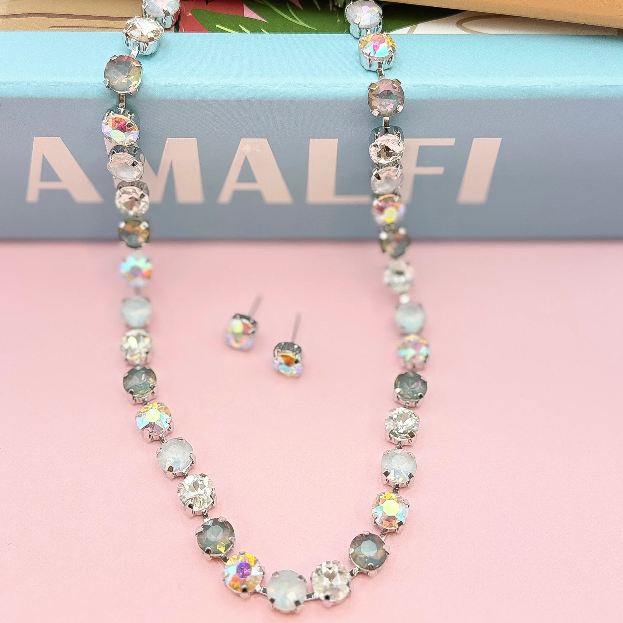 Crafted with precision, the Moonlight Mirage Necklace features an exceptional combination of silvery tones and opalescent elements that create a sophisticated luminescence. The carefully calibrated cool-toned glow mimics the optical properties of captured stardust, providing versatile elegance for formal occasions or statement styling. This technically superior necklace and stu