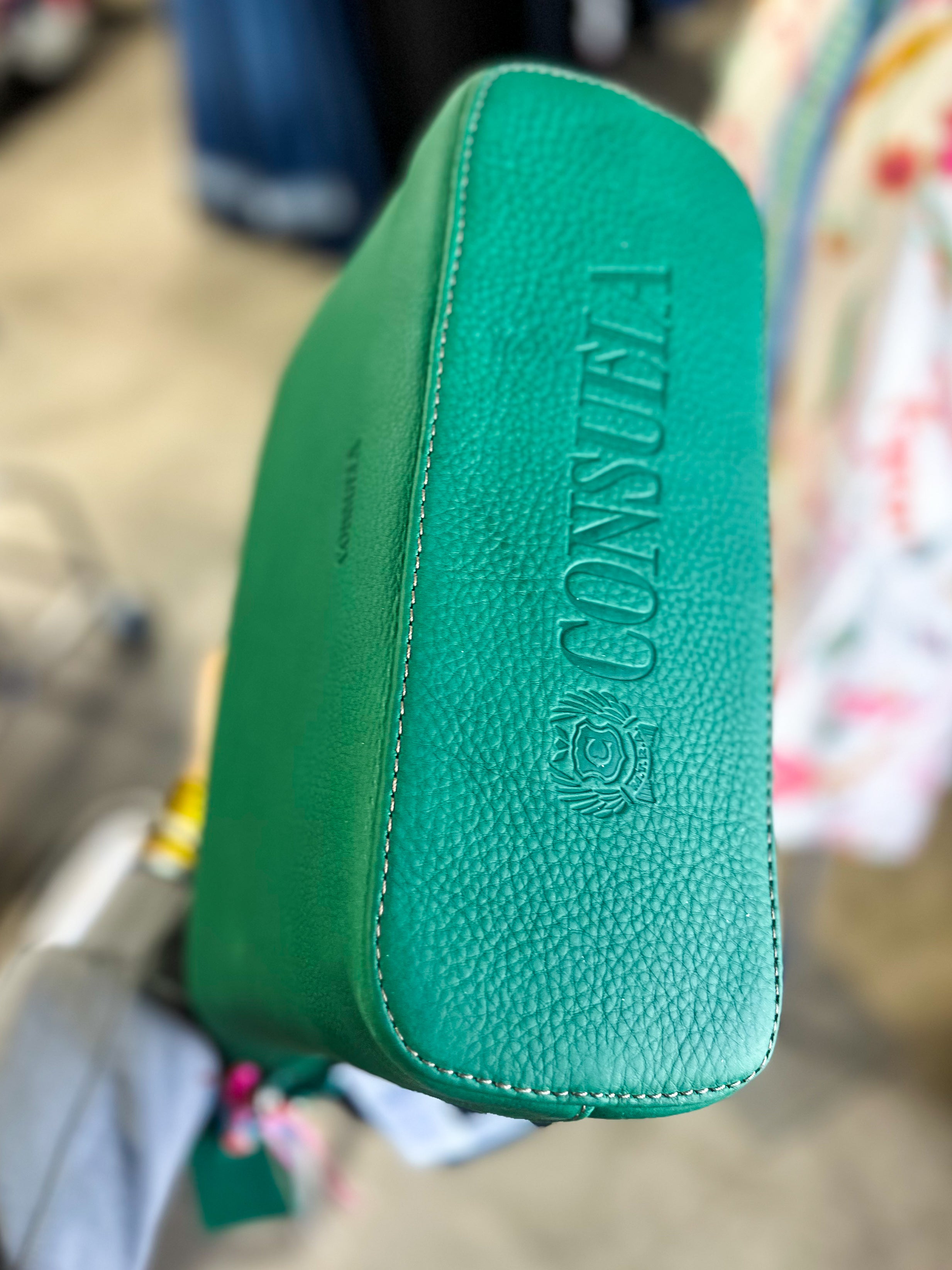 - Trimmed in Teal green leather