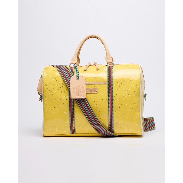 This spacious and colorful duffel is the perfect carry-on for a weekend getaway, making a statement with functionality, durability, and style. Topped with natural leather handles and an adjustable webbing strap, the Jetsetter is crafted to hold its shape and makes traveling easy with ample interior storage and functional pockets.