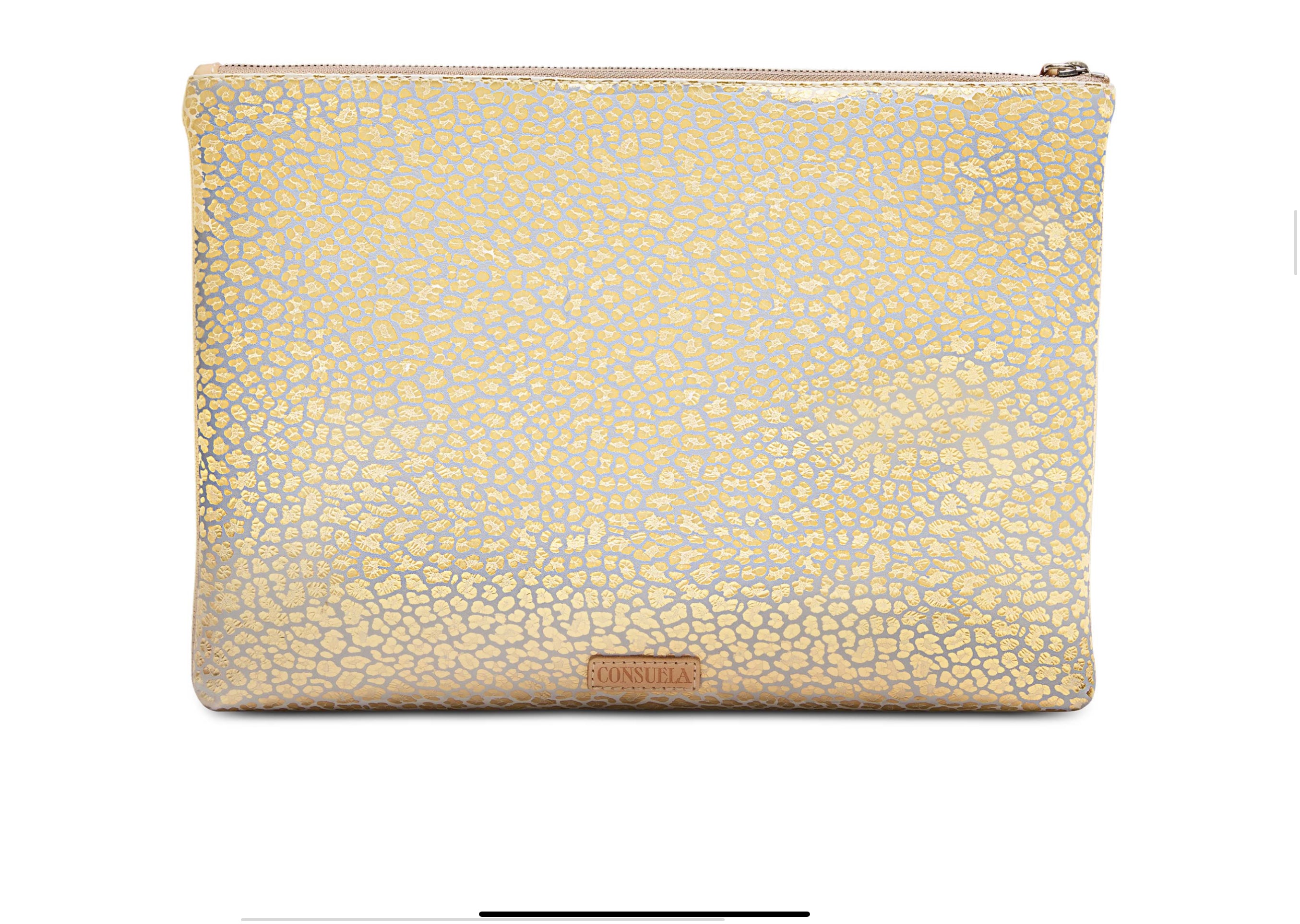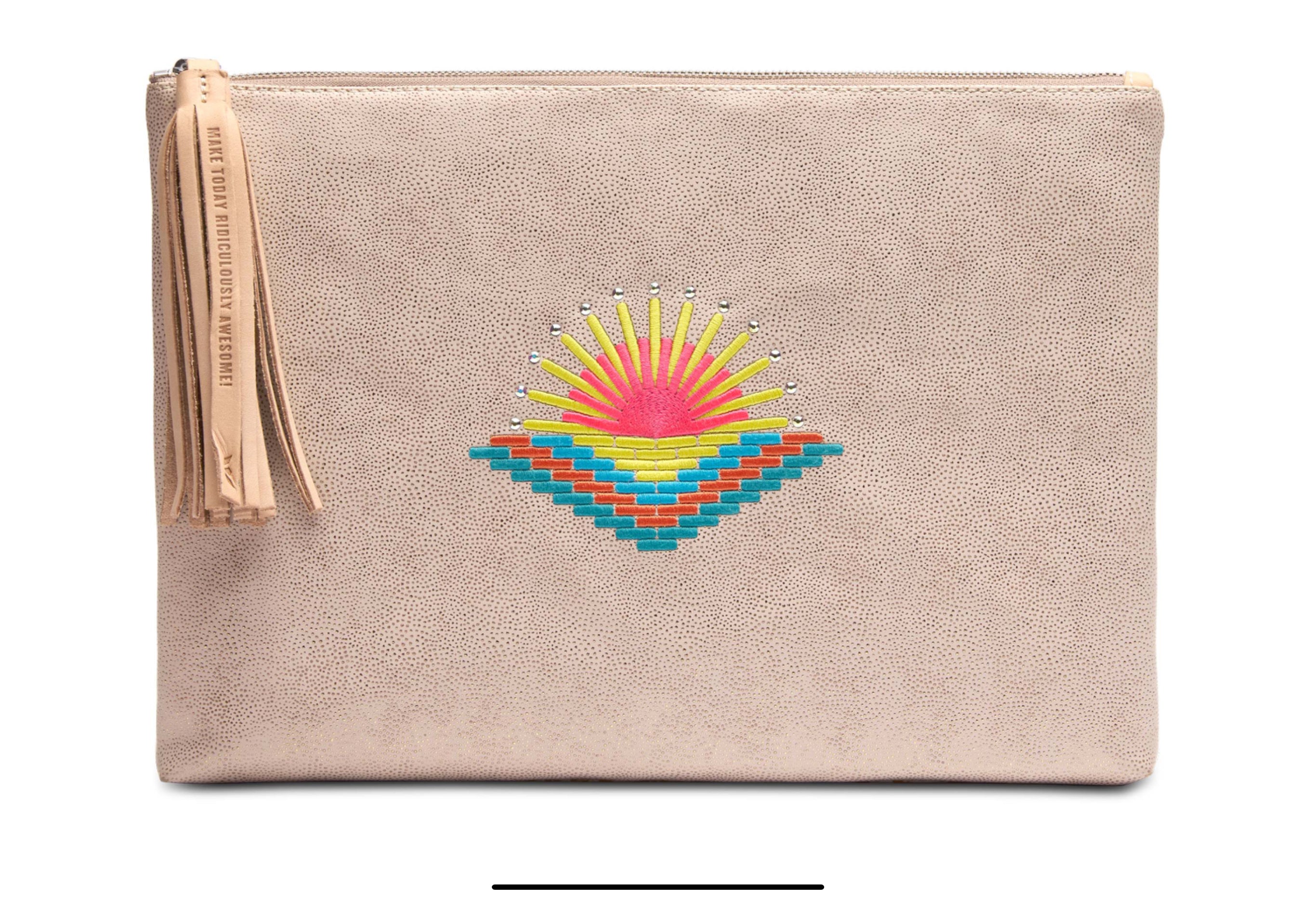 The Take Me Out Clutch was made to stand out! This unique pouch can be carried as a colorful clutch or stashed in a larger bag for stylish organization. This embroidered zipper pouch is large enough to fit most tablets, notebooks, and up to a 12” laptop.