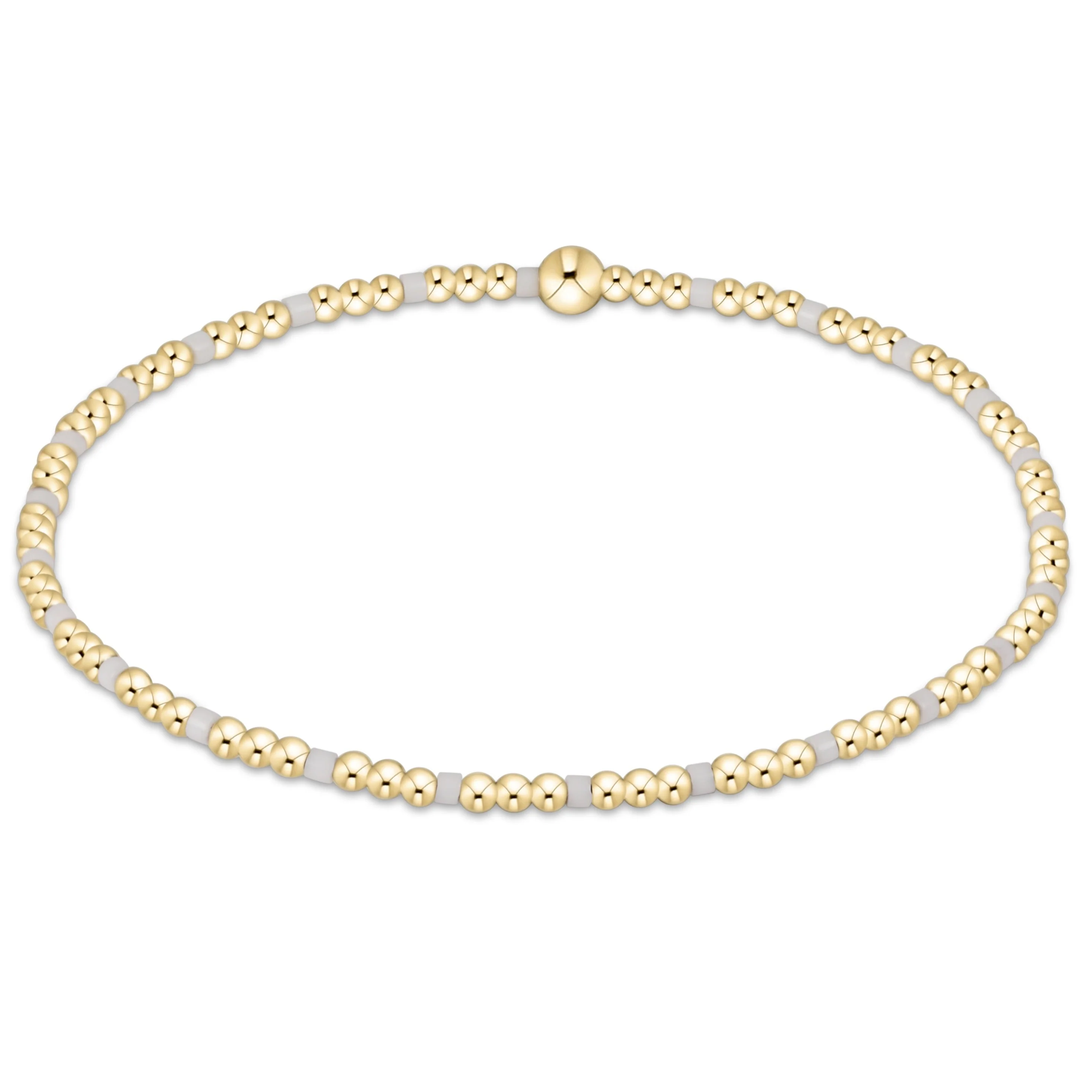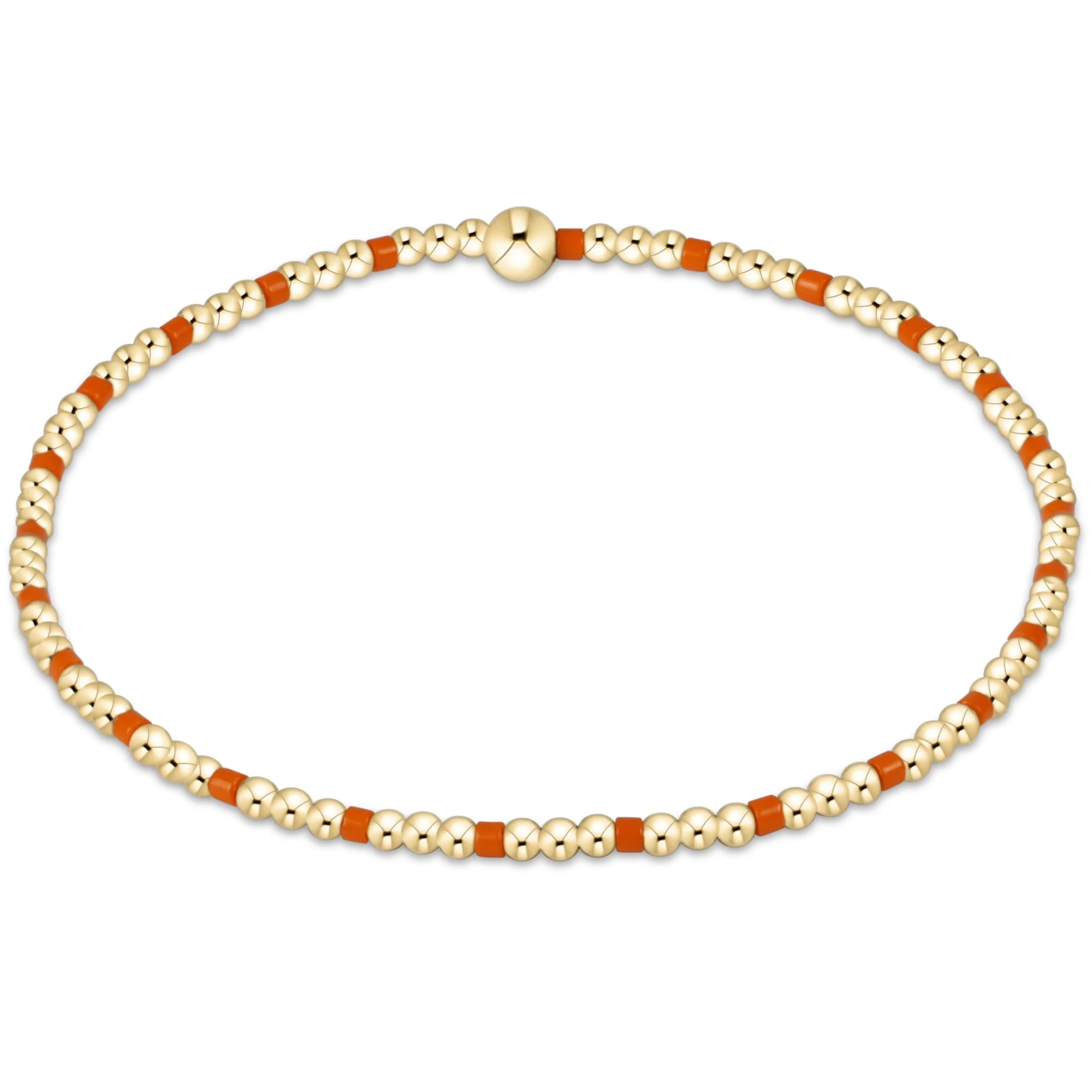 The Gameday Hope Sincerity Pattern bracelet features gold-filled 5mm beads paired with delicate 2mm seed beads, expertly hand-beaded on high-performance elastic for a comfortable, slight stretch. Measuring a standard 6.25", it offers worry-free wear—durable enough to keep on while sleeping, showering, or sweating. Designed for easy stacking, this bracelet complements any collection with both style and resilience.