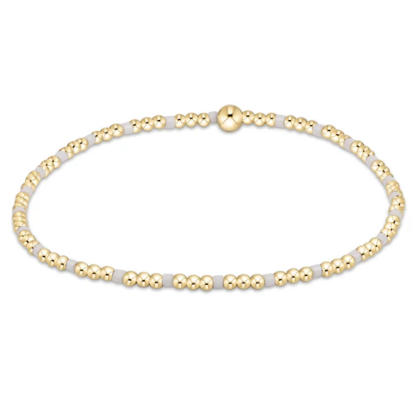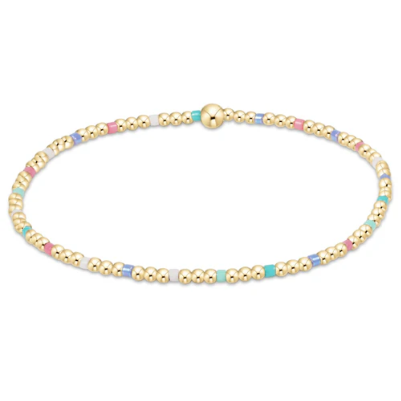 Embrace the vibrant spirit of spring and summer with the Hope Sincerity Pattern bracelet. Expertly handcrafted using a blend of 2mm seed beads in assorted colors and 2mm 14k gold-filled beads, this piece offers subtle elegance and durability. Measuring a standard 6.25 inches, it is strung on high-performance elastic that provides a gentle stretch for effortless wear and removal. Perfectly balanced for both style and comfort, this bracelet adds a refined touch to any ensemble.