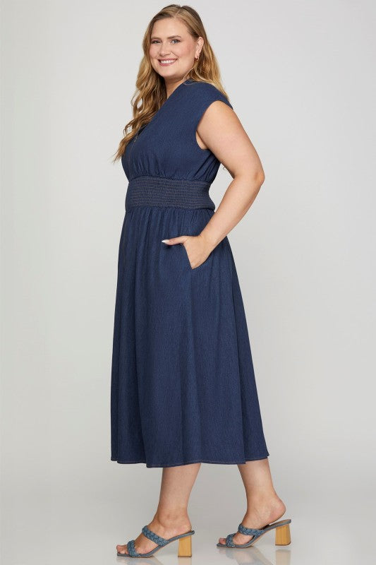 This washed denim midi dress features a relaxed drop shoulder design and a smocked waist for a flattering silhouette. The front zip closure offers easy wear, while side pockets provide practical storage. Its durable denim fabric combines style with comfort, perfect for versatile, everyday use.