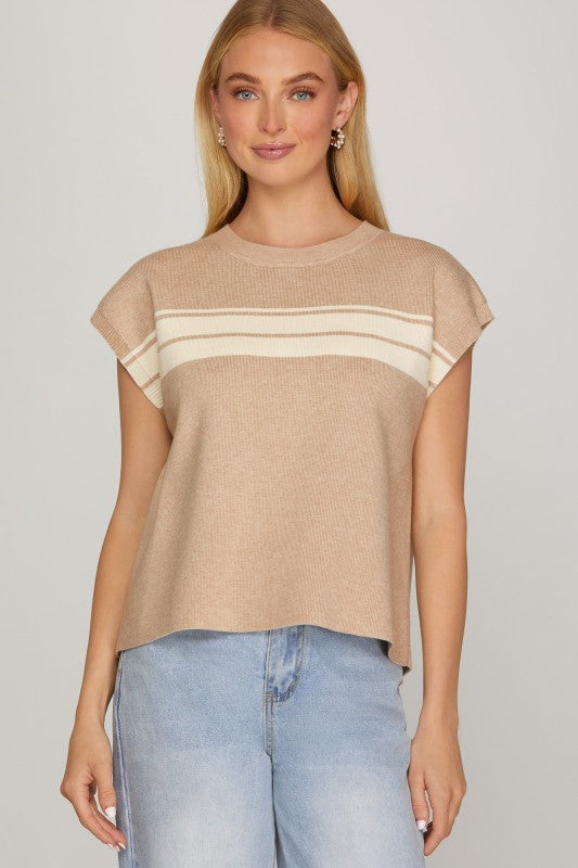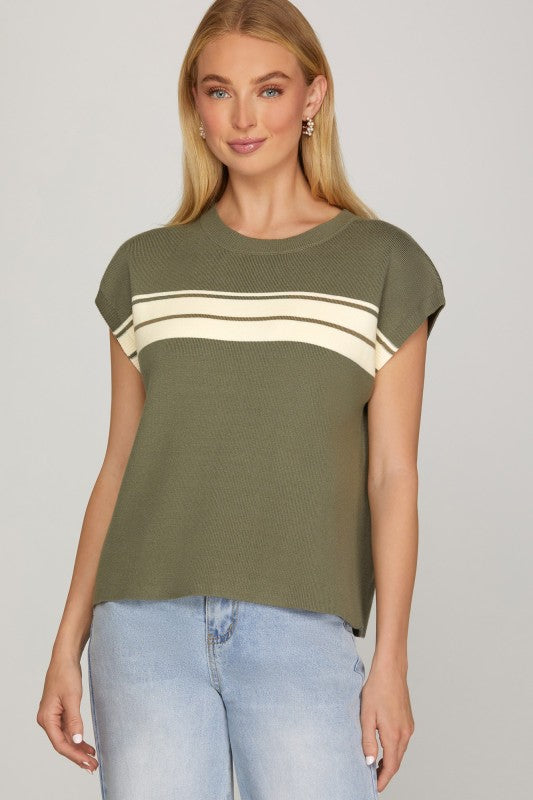 This sleeveless round neck striped sweater top offers a refined blend of comfort and style. Crafted for breathability and ease, its sleeveless design allows for versatile layering or standalone wear during warmer seasons. The classic round neckline and subtle stripes create a timeless look suitable for both casual and professional settings, making it an essential piece in a well-curated wardrobe.