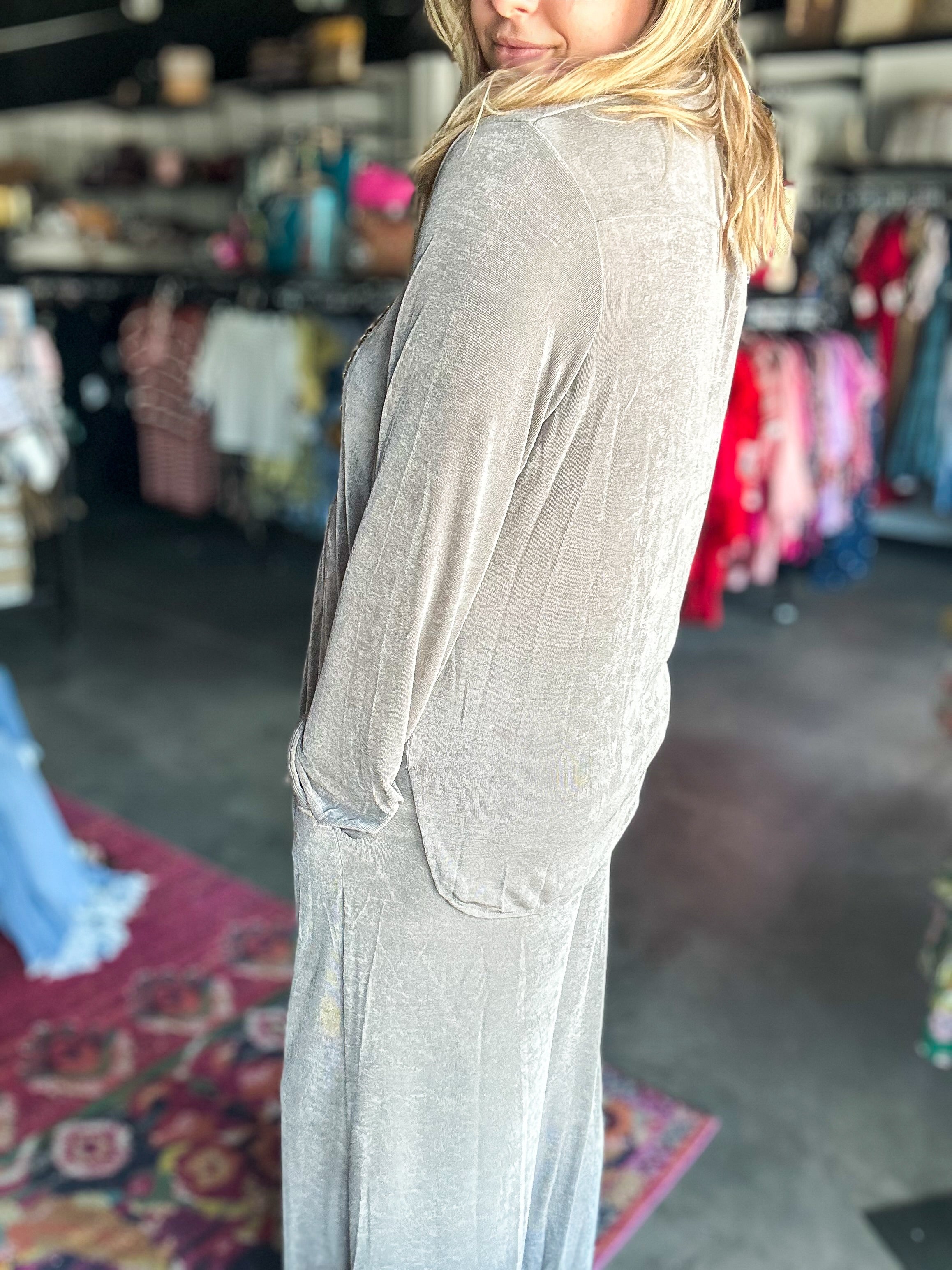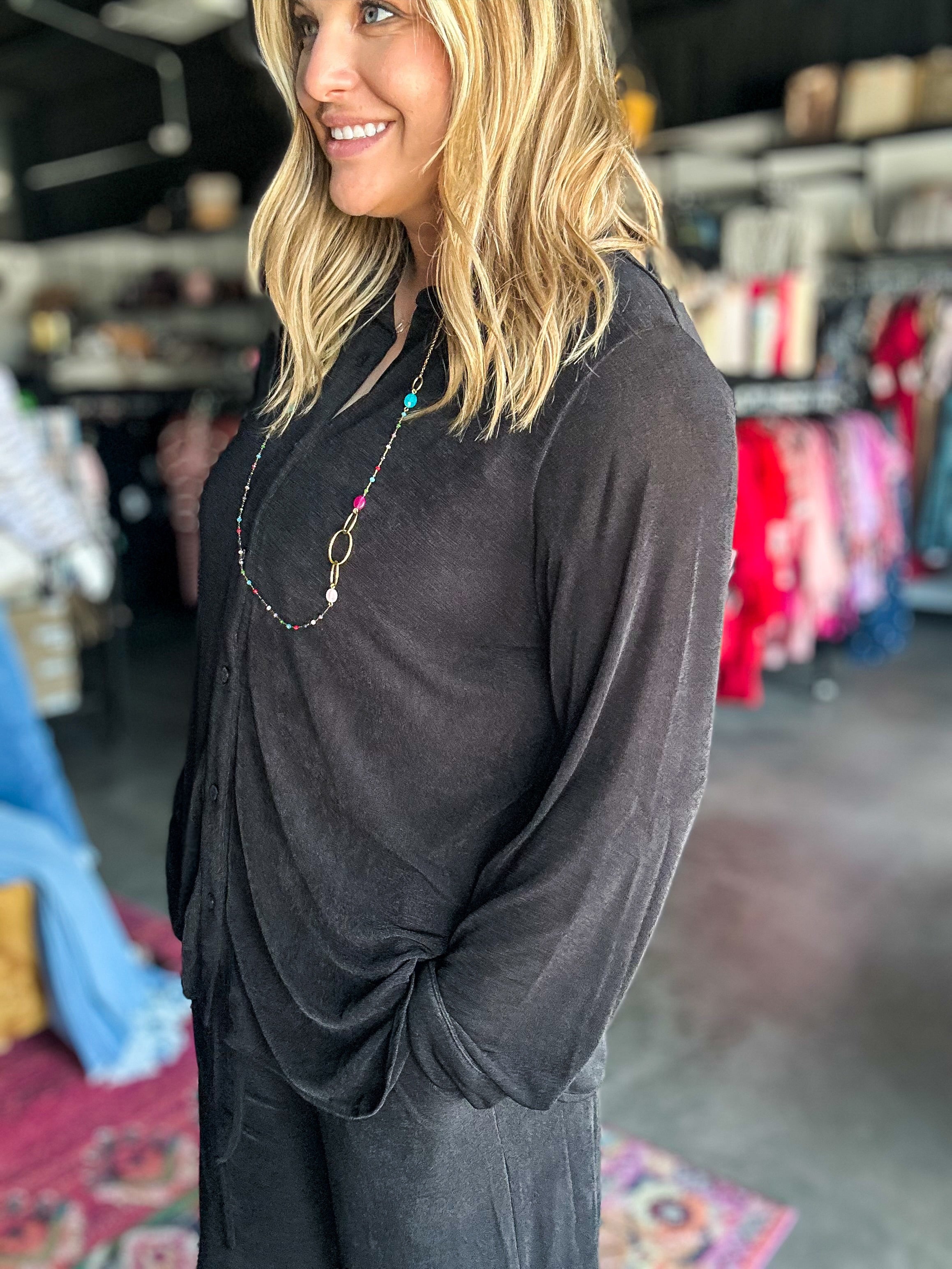 Elevate your wardrobe with Lauren's Slinky Shirt and Pant Set, featuring a sleek long sleeve button-down shirt paired with matching long pants. Designed for a polished, professional look, this set offers both comfort and style, making it ideal for workdays or sophisticated casual occasions. The tailored fit ensures a flattering silhouette, while the quality fabric provides ease of movement throughout your day. Perfect for those who value refined simplicity and expert craftsmanship in their attire.
