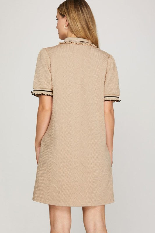 Stephanie’s Ribbed Collar Dress features a half-sleeve design and a tailored ribbed band collar for a refined silhouette. Its mini length offers a modern, versatile look suitable for both casual and semi-formal occasions. Crafted with textured fabric that ensures comfort and shape retention, this dress balances style and function with expert attention to detail.