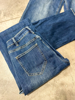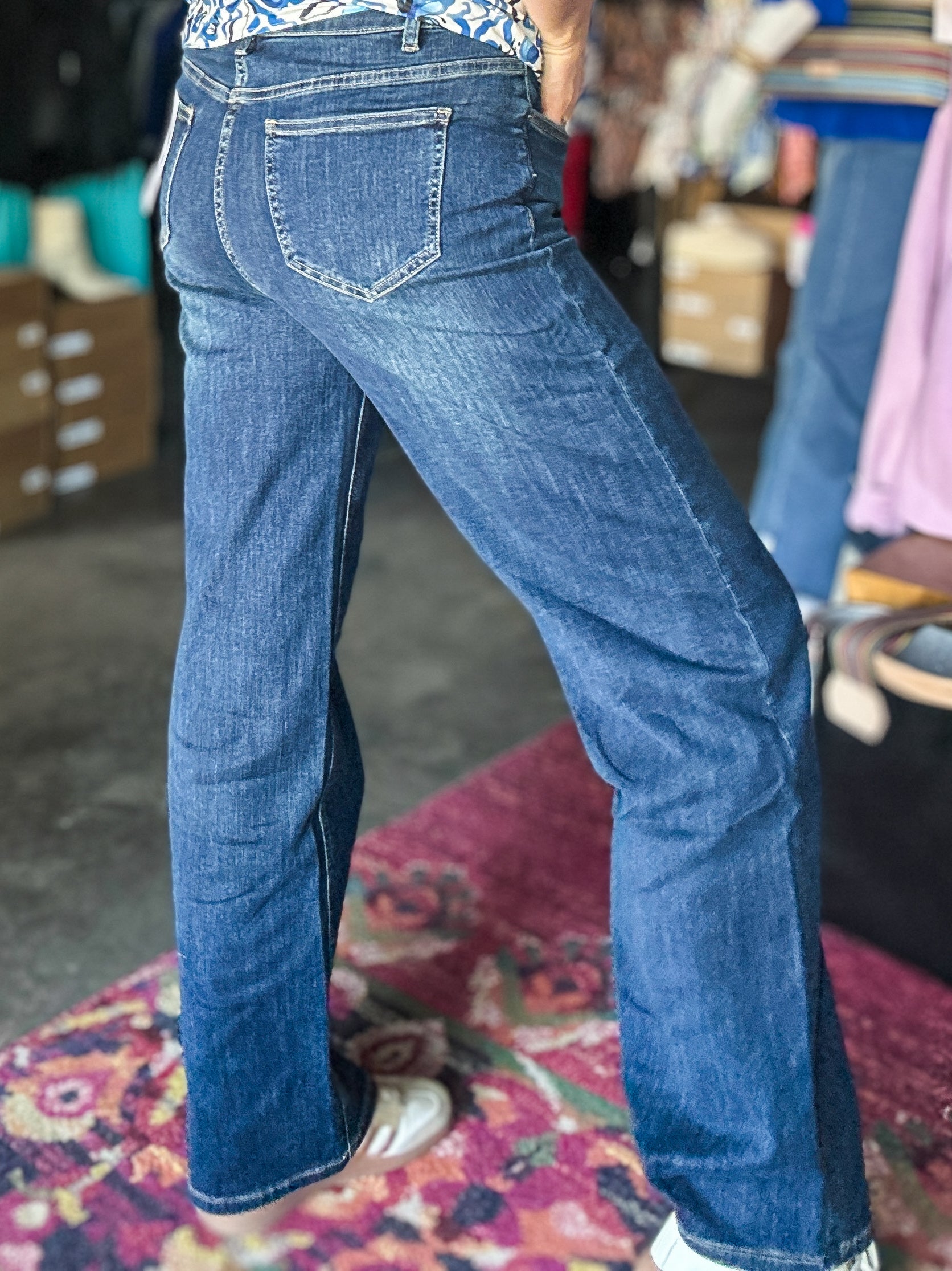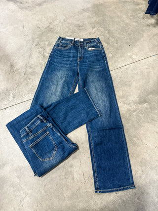 The Chelsea Blue Super High Straight Leg jeans feature a loose fit for maximum comfort and movement. Made with a blend of cotton, polyester, and spandex, they provide a soft yet stretchy feel. With a front rise of 11 1/2 inches, inseam of 32 inches, and leg opening of 18 inches, these jeans offer a super high rise and a sleek, straight leg style.