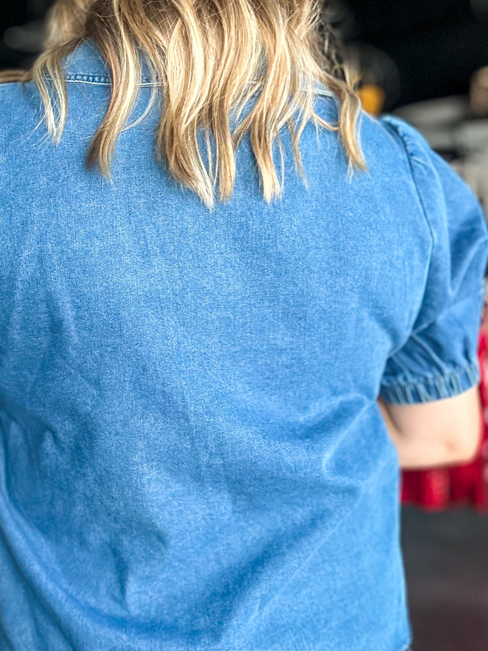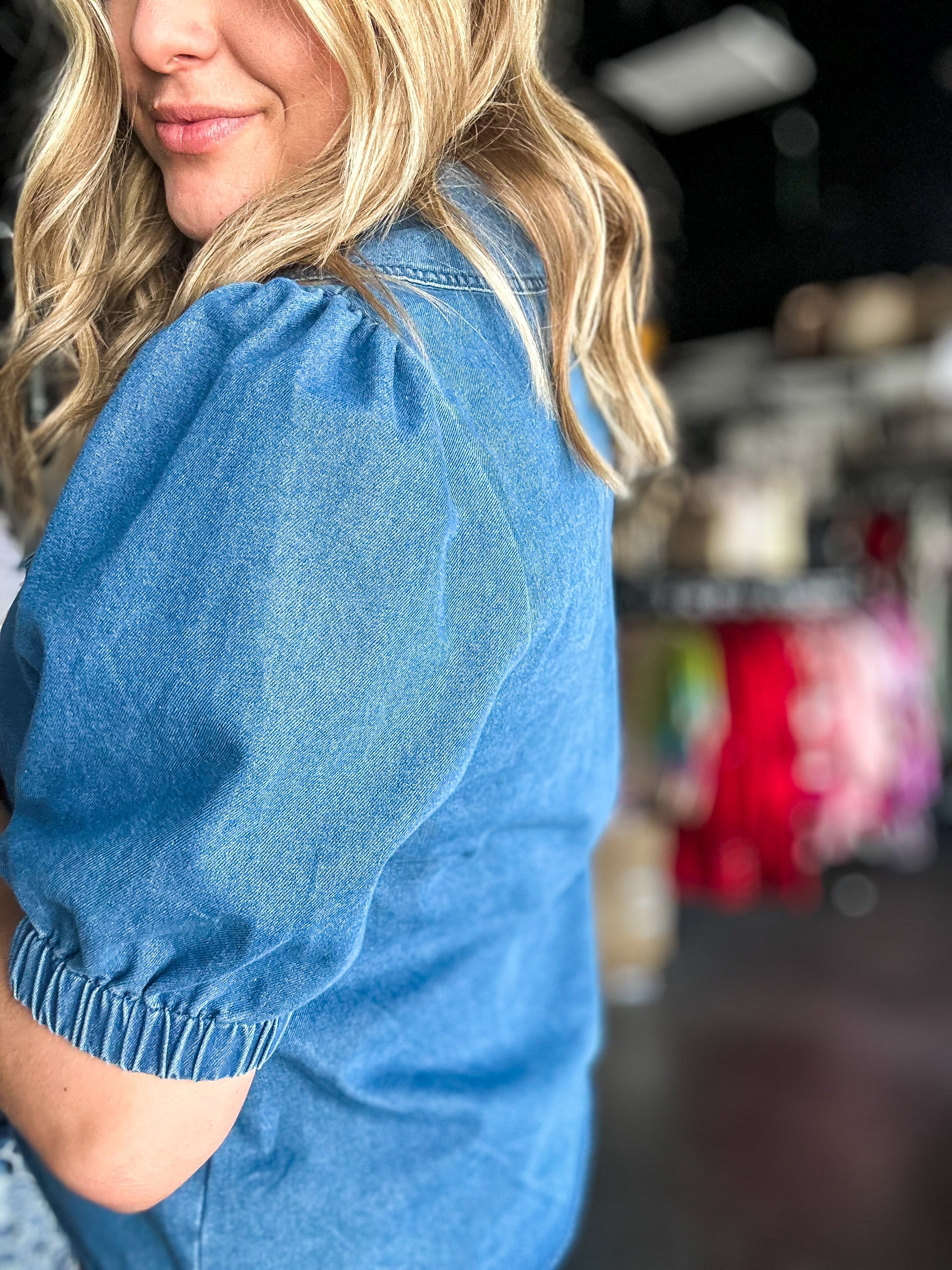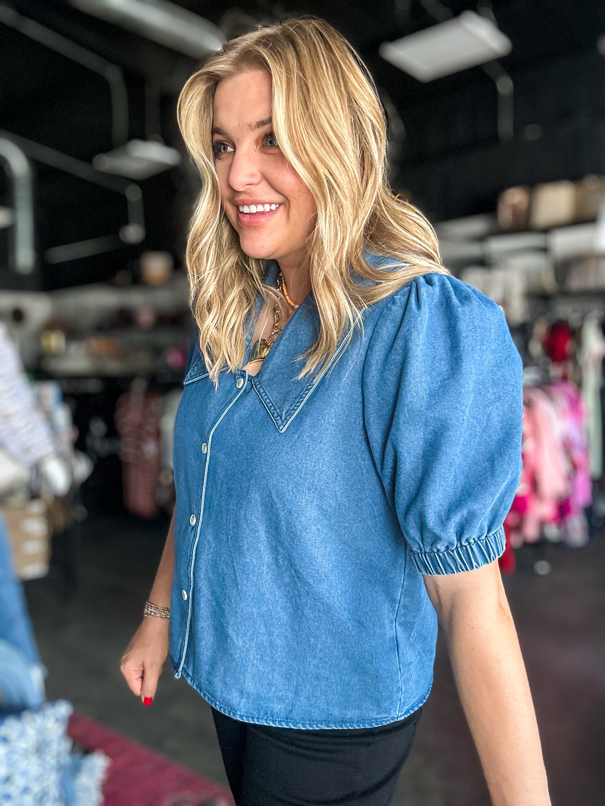 Elevate your wardrobe with our Ft. Worth Gal denim top! Designed with a wide chelsea collar and elasticated sleeves, this top offers both style and comfort. The non-sheer, lightweight woven fabric and front button closure make it perfect for any occasion. Add a touch of chic to your outfit with this versatile piece.