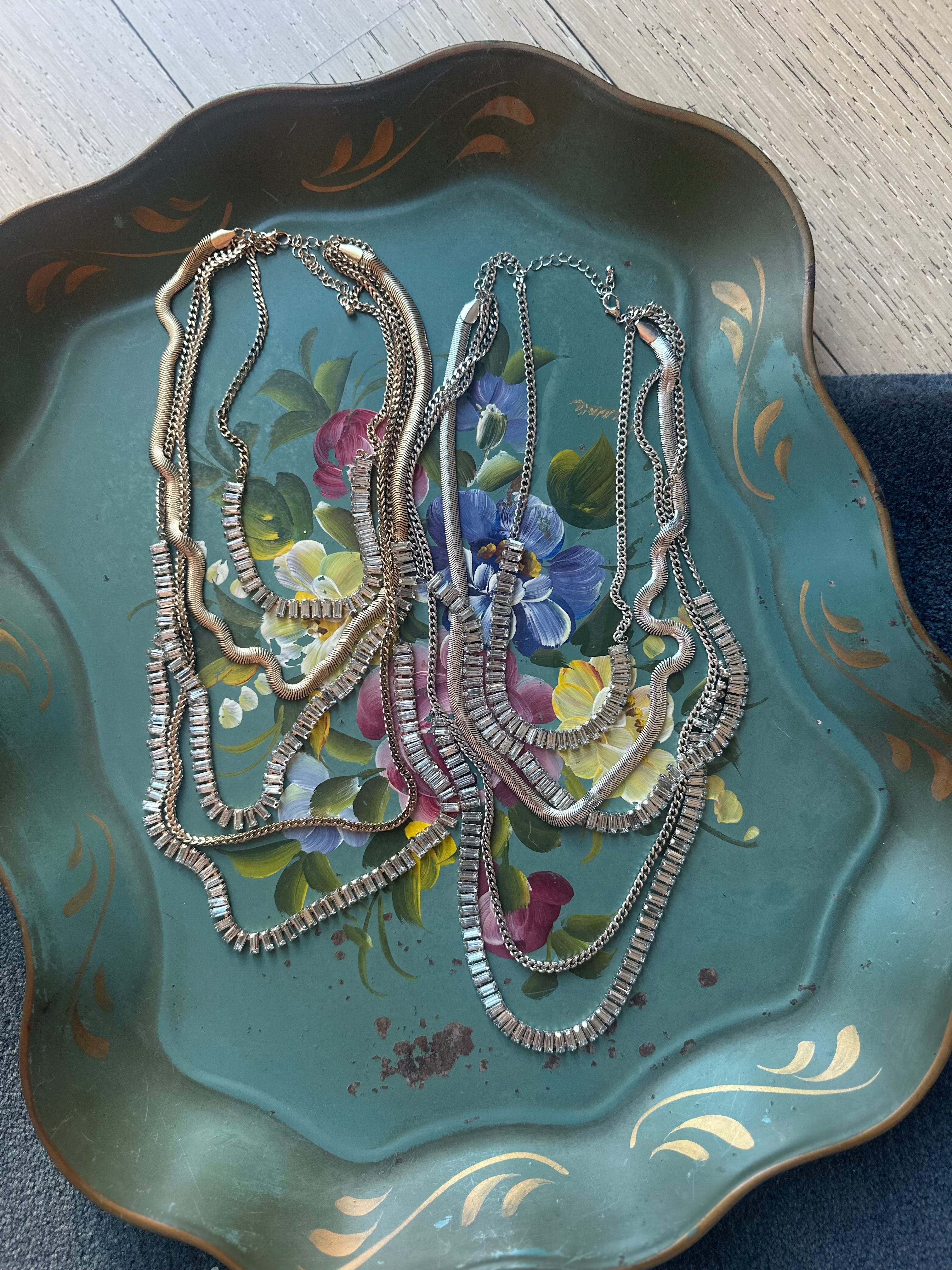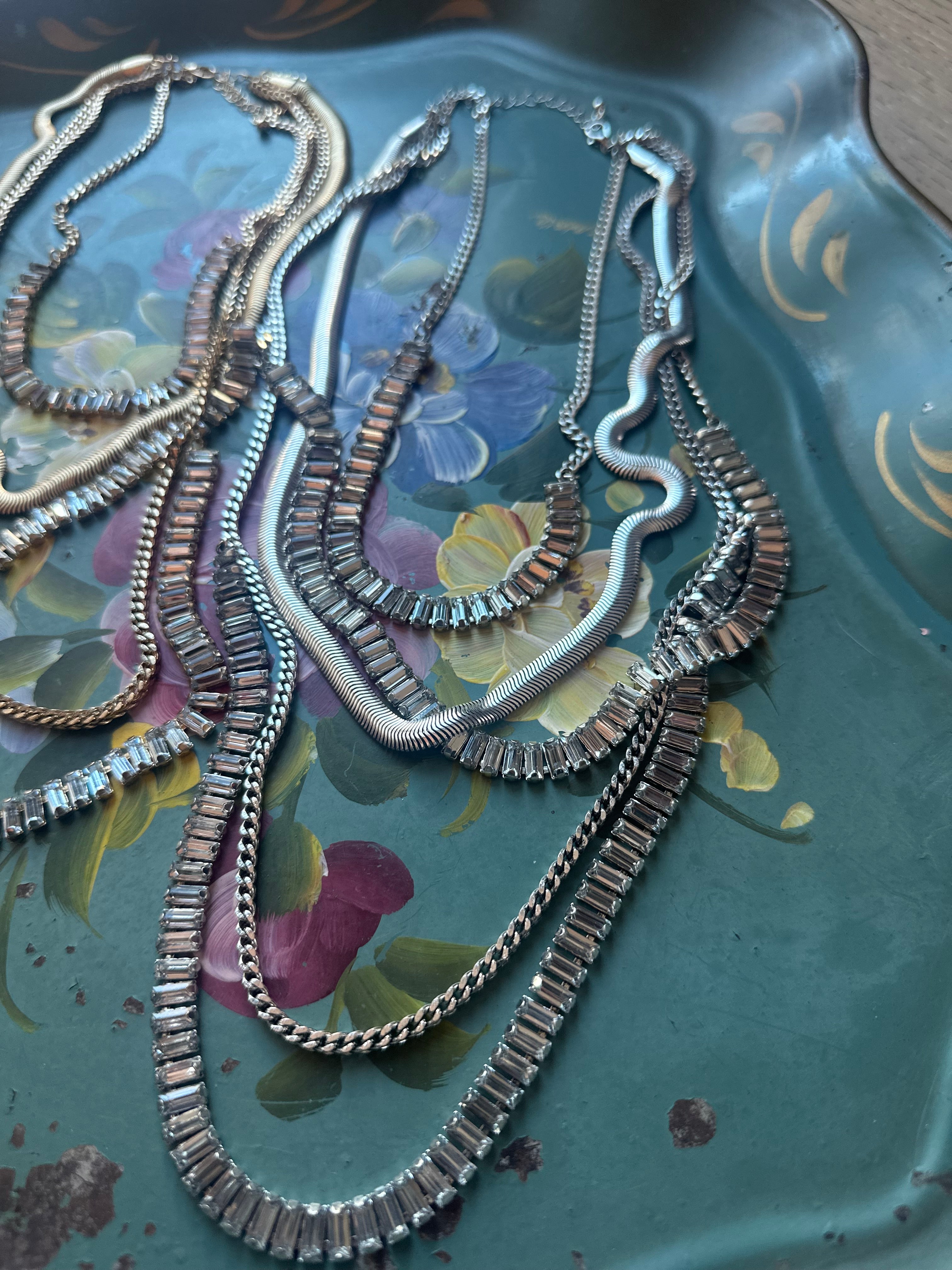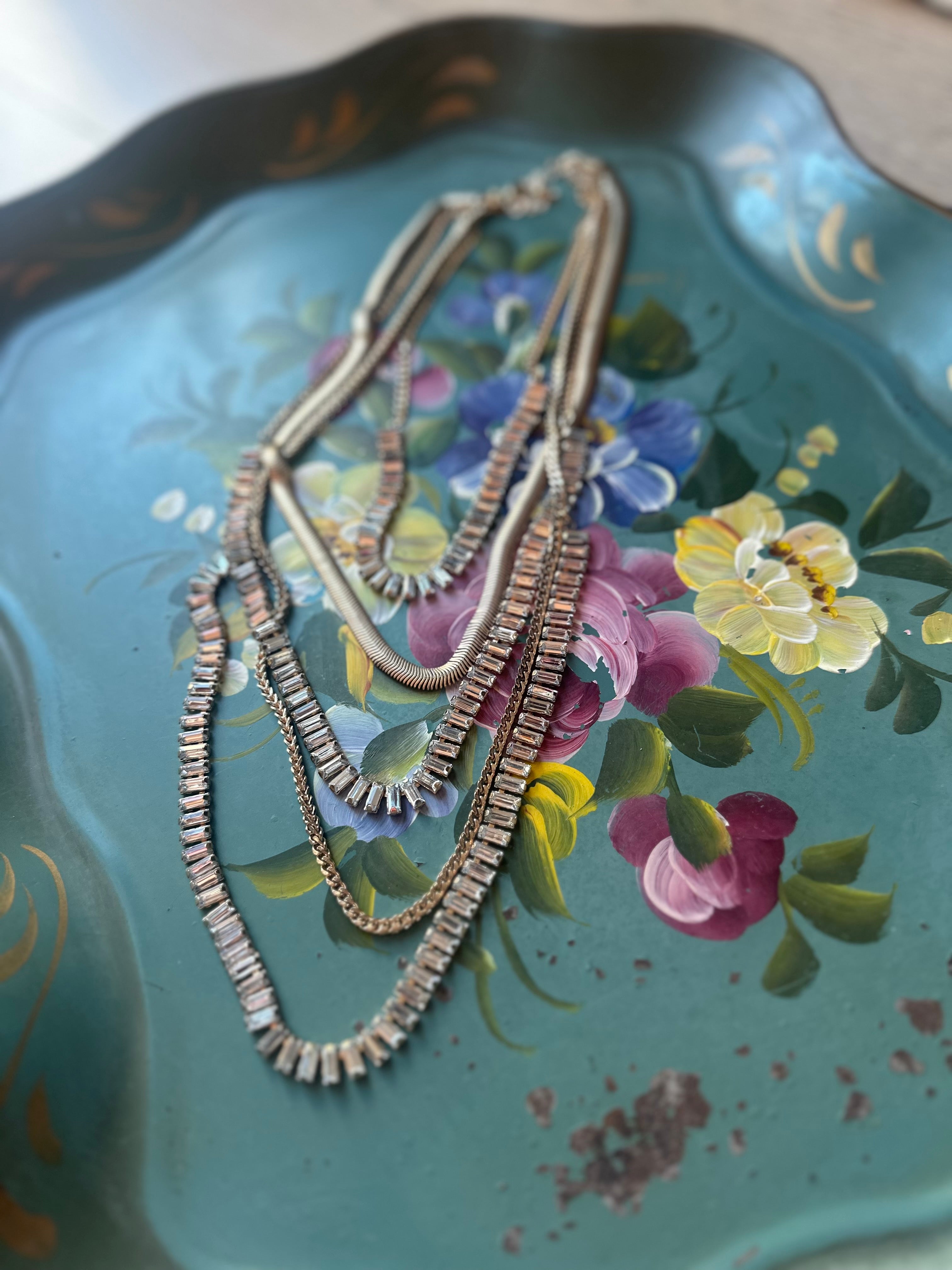 Stacks on Stacks on Stacks. You will love this multstrand necklace for a seamless necklace stack to wear day to night. Composed of Chains, rhinestones, and sass--this will be an easy Go to for any occasion.