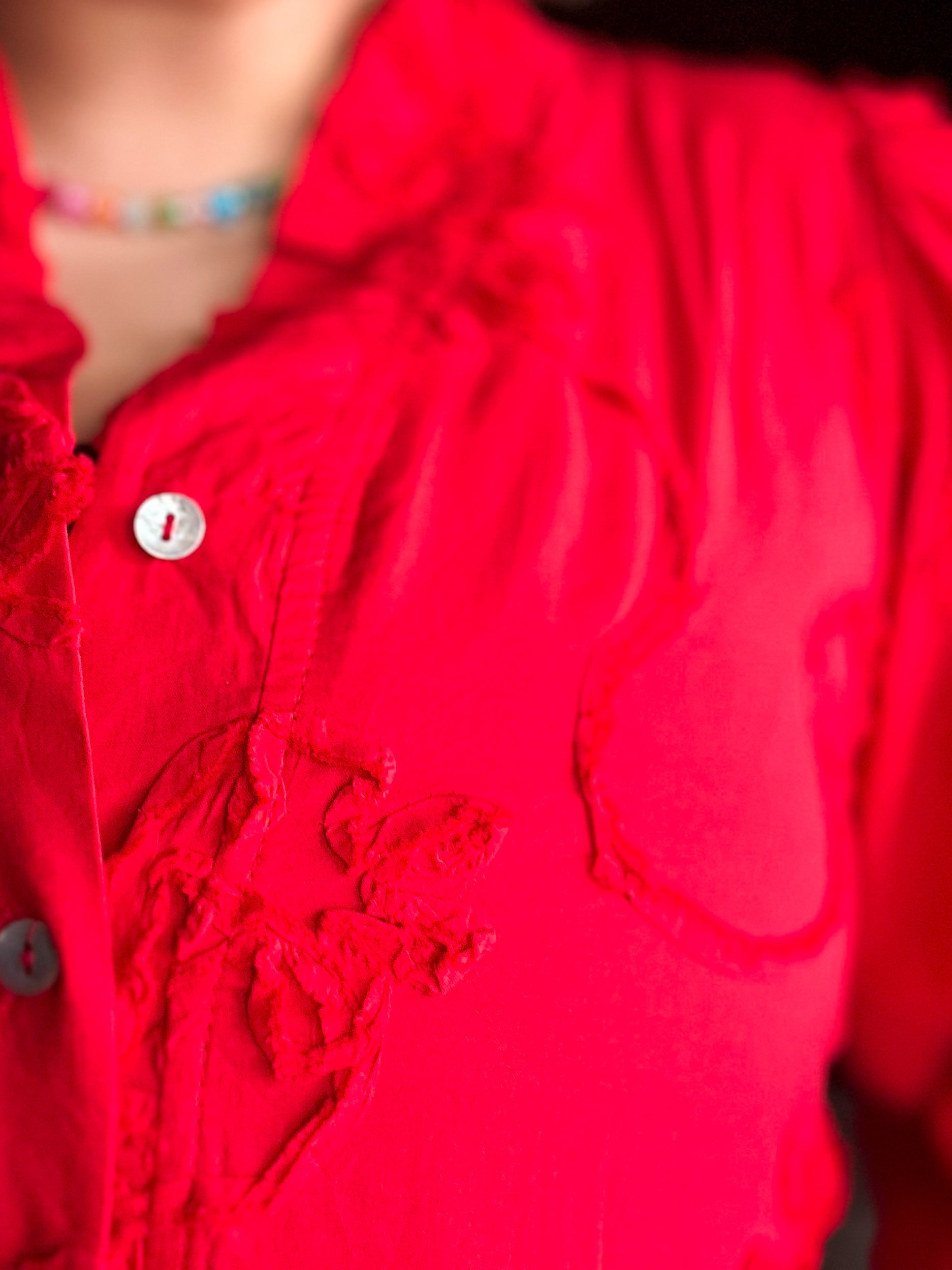This sophisticated 3/4 sleeve button-down top features a rich 3D floral texture and a delicate ruffled neckline, creating a refined and chic look. Crafted from textured fabric, it offers subtle depth and elegance. The structured yet feminine design balances professional appeal with artistic detail, perfect for elevating your wardrobe!