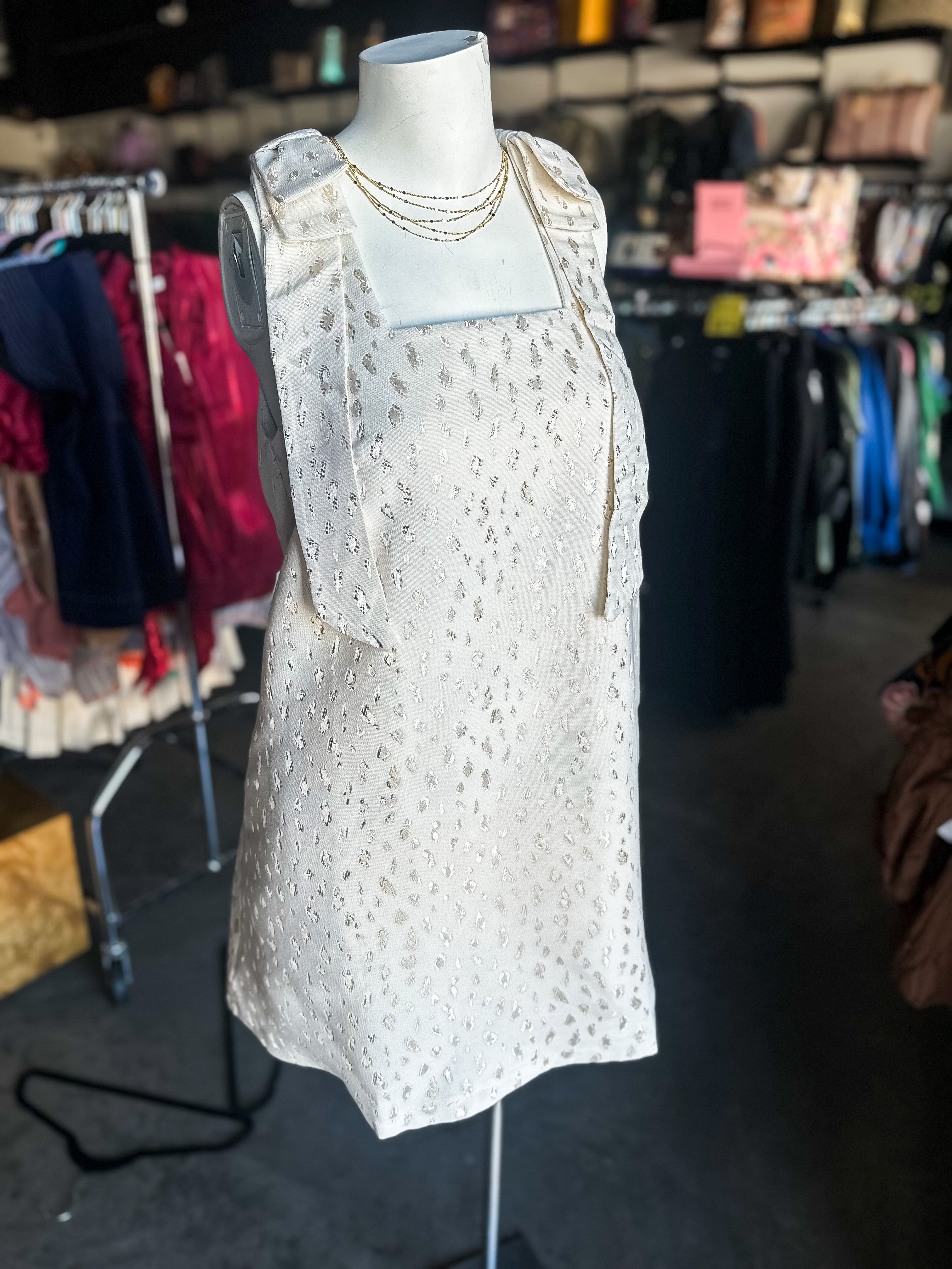 Meet Cally! This gorgeous shift dress is adorned with Animal jacquard fabric. This dress shows off the latest trend with a layered bow detail on the top of the shoulder. To top it off with a cherry, this dress has pockets and lined for comfort.