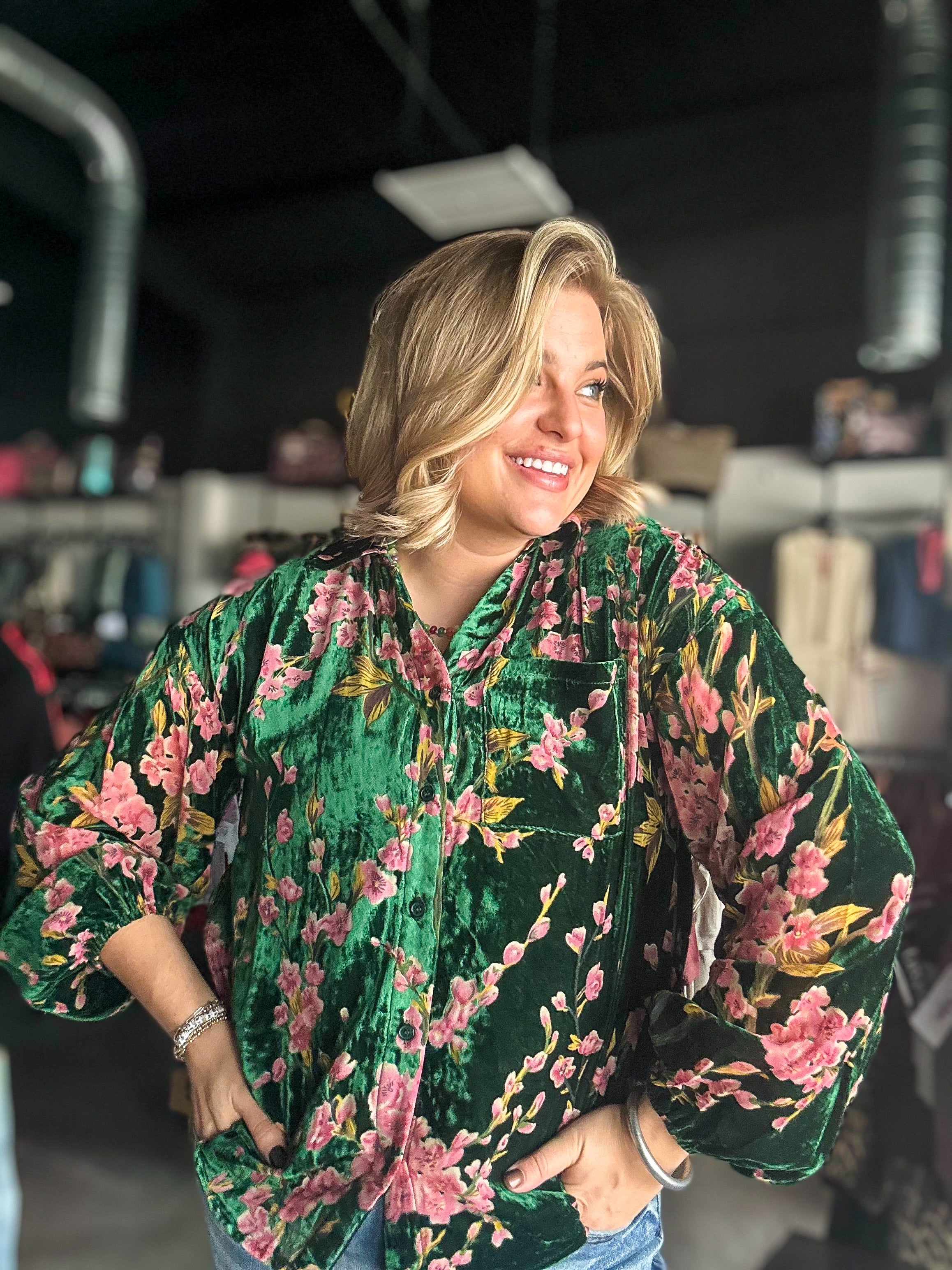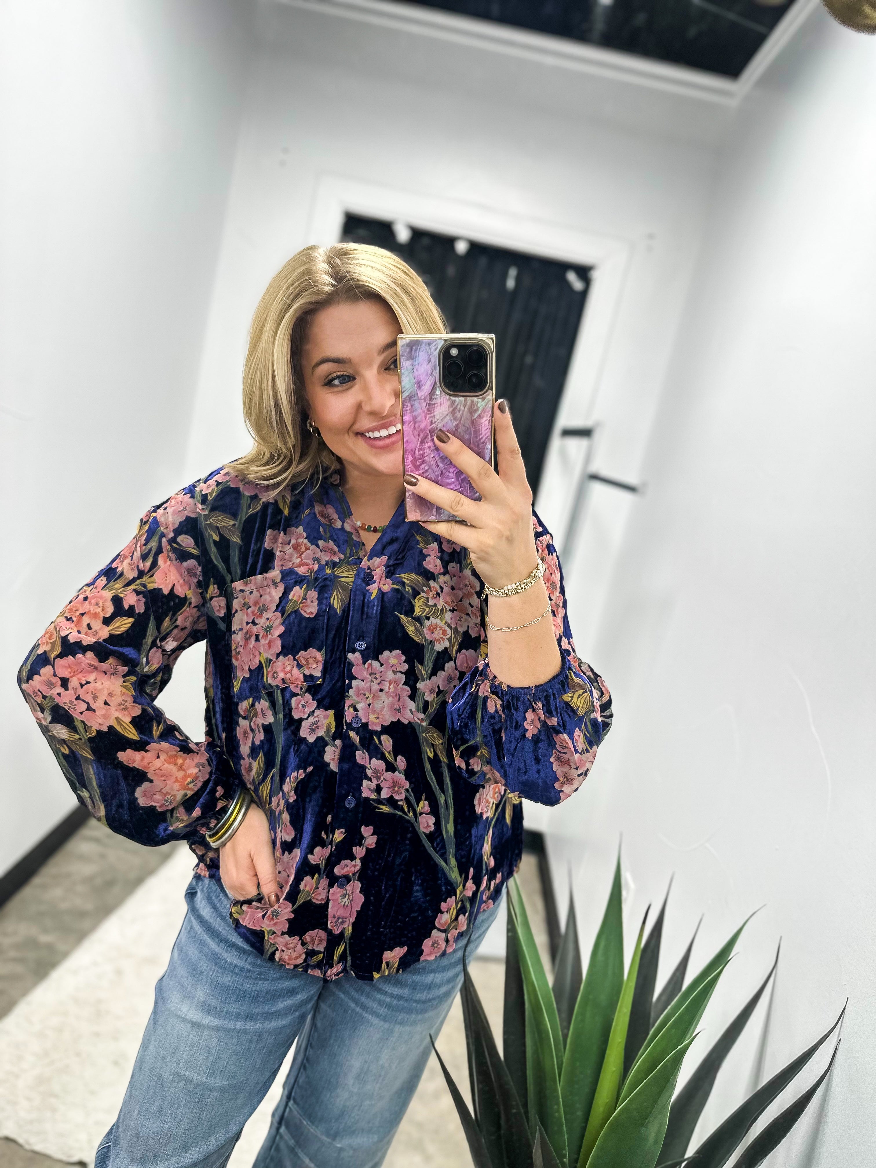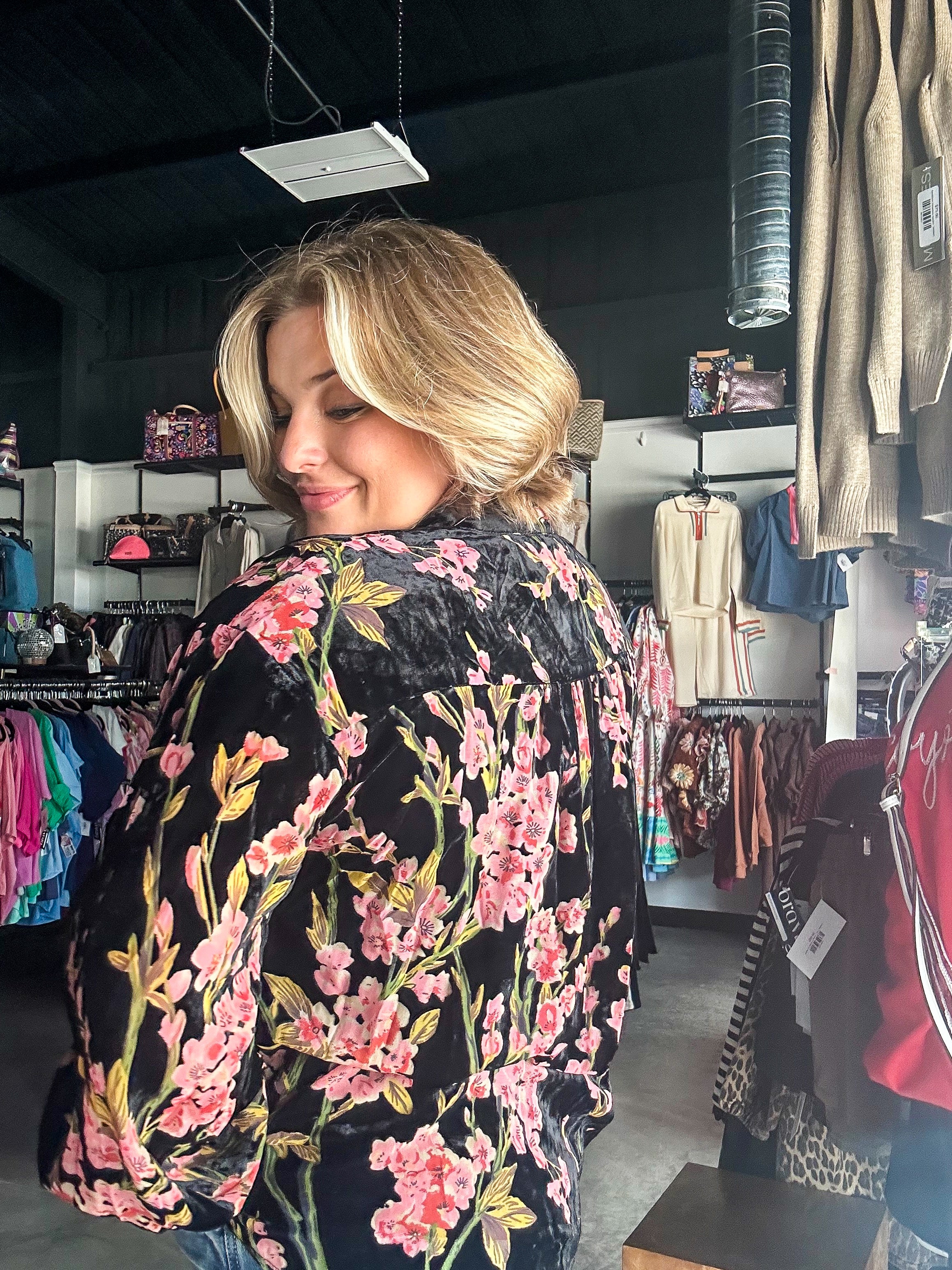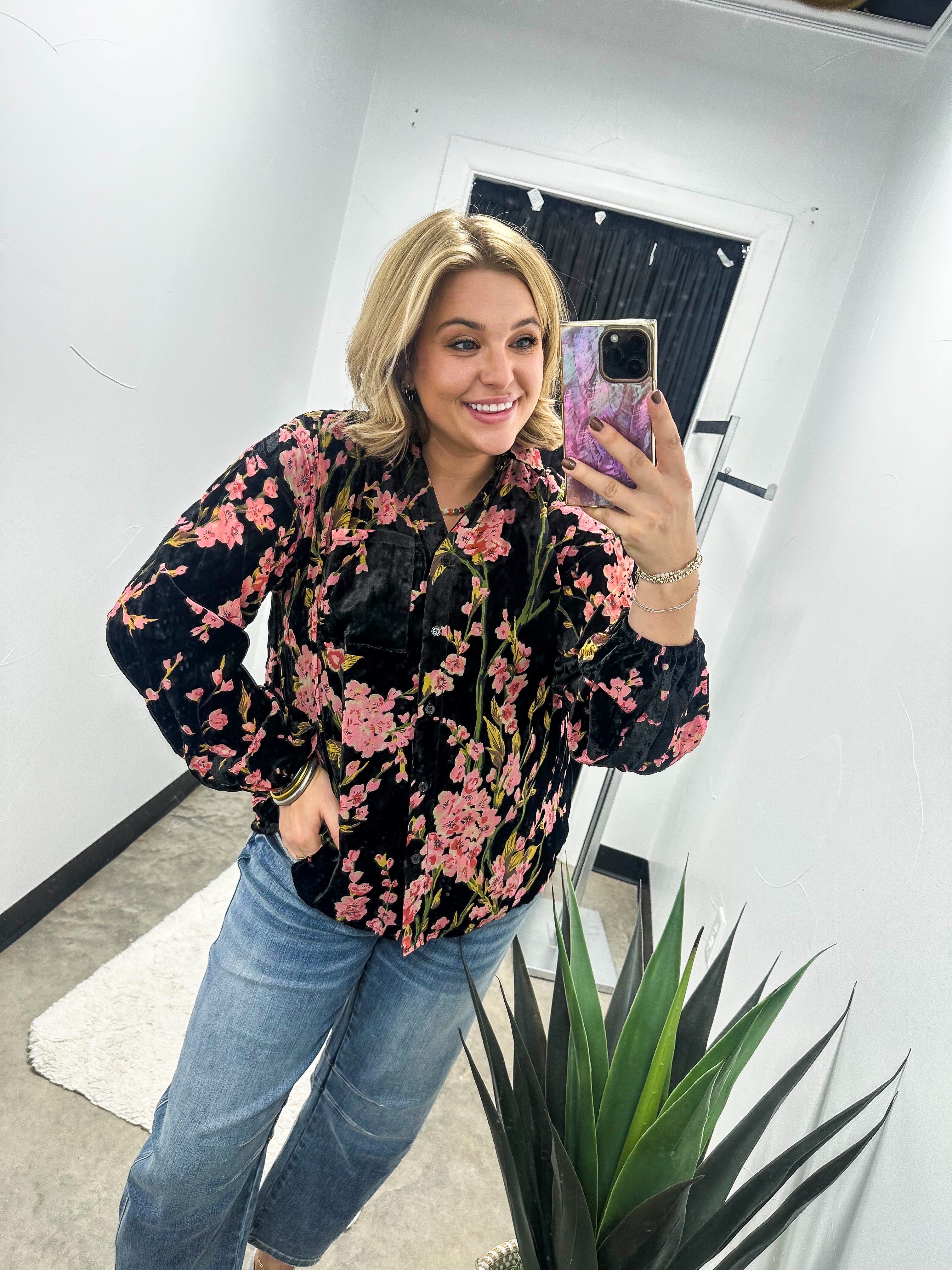 The cherry blossom velvet top is a piece that you will be able to wear day to night. With balloon sleeves finished with an elastic cuff--this shirt is chic and easy to wear. The fabric is adorned with a burnout pattern to highlight the gorgeous cherry blossom pattern. The collar, back pleating, and front pocket will make this an easy to wear and dressy staple in your closet.