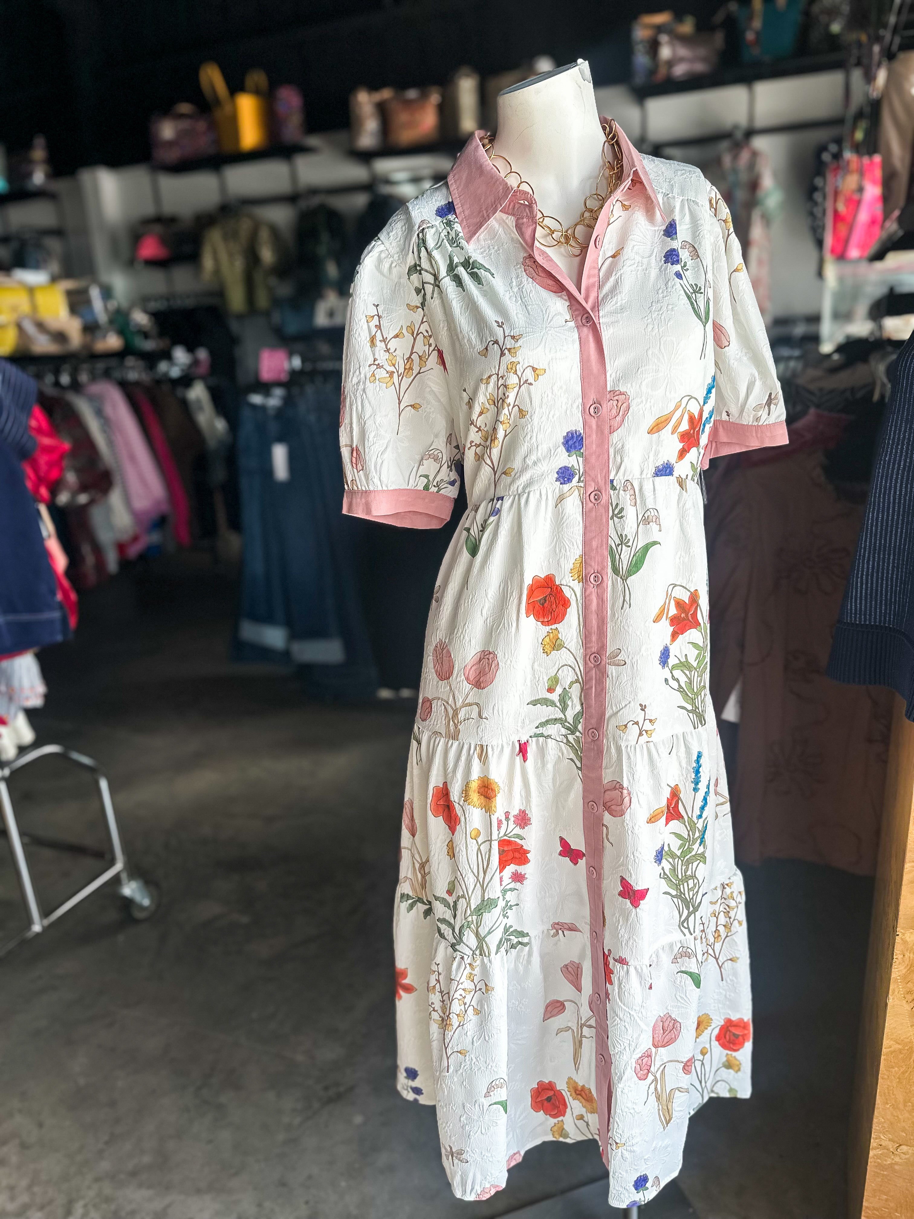 This is a piece you would think you found at a very high end department store. The details are chef's kiss! This jacquard fabric has a flattering tiered silhouette, gorgeous button down front, short puff sleeves, and is lined. The collar and dress is trimmed with a gorgeous ballet pink.