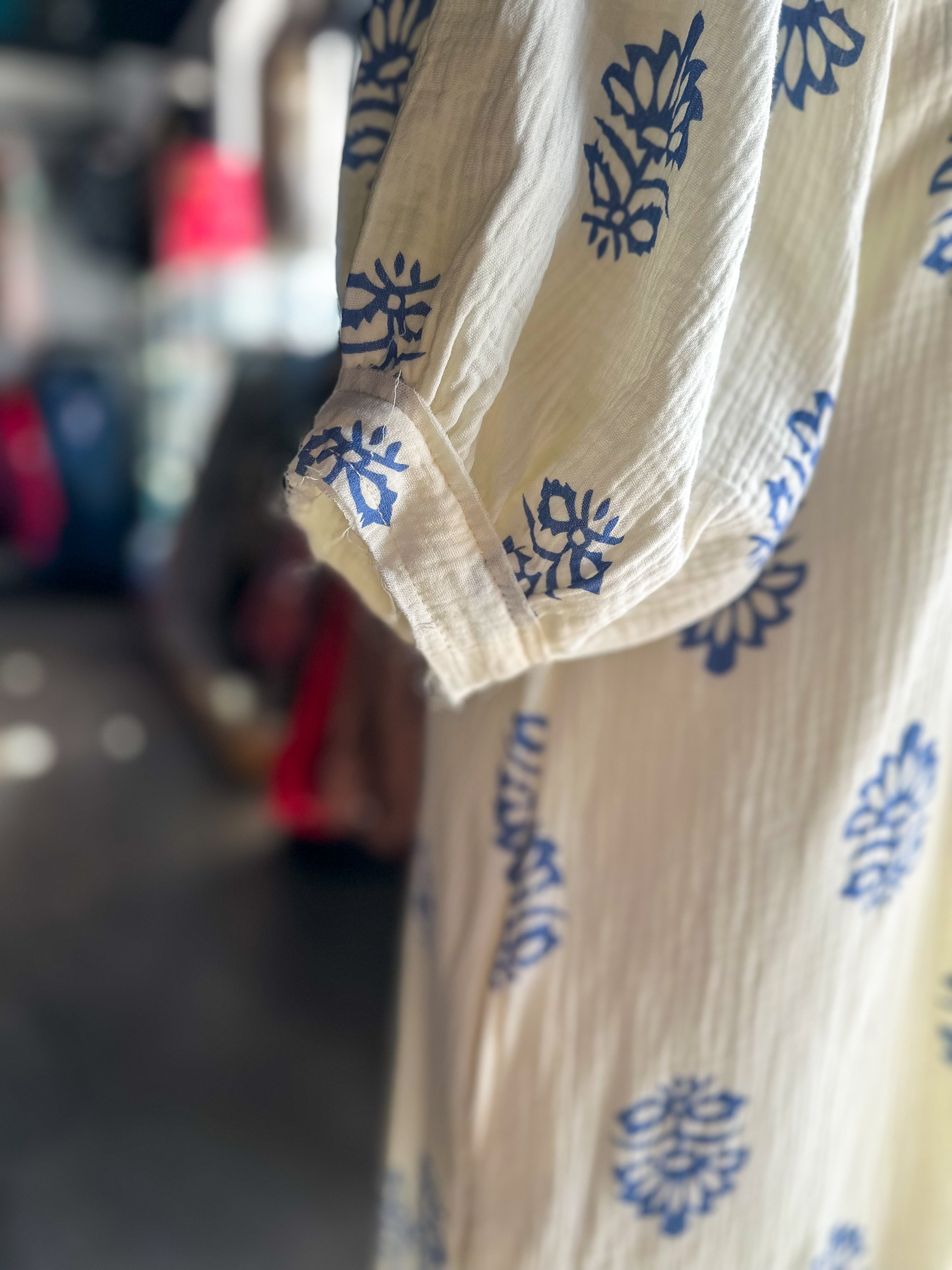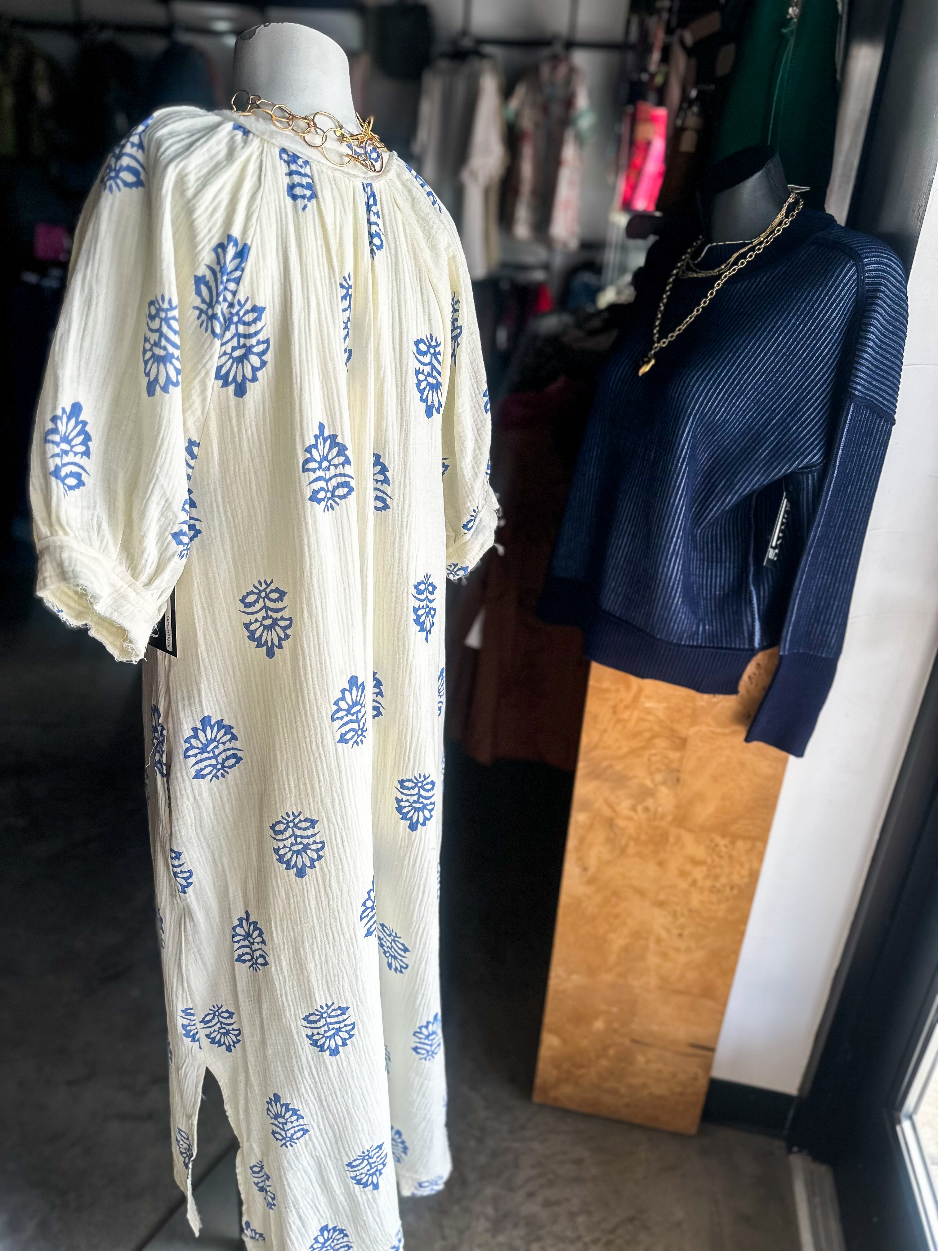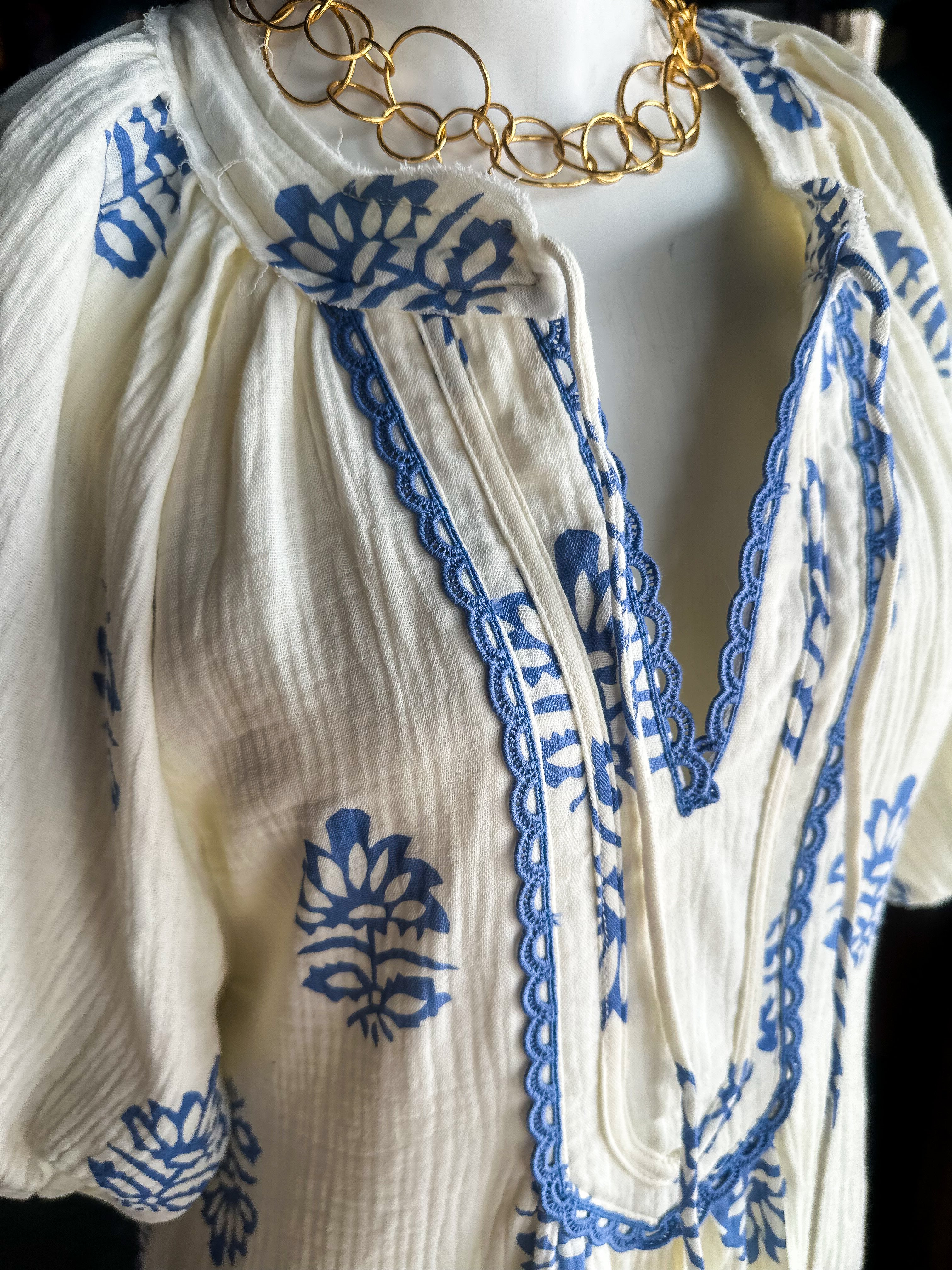 Say hello to your new favorite summer dress. This 100% Cotton Gauze is printed with delicate blue designs. Featuring a split neckline with tassle ties, short sleeves, pockets, side hem slits, and a lace trim this will be a favorite for years.