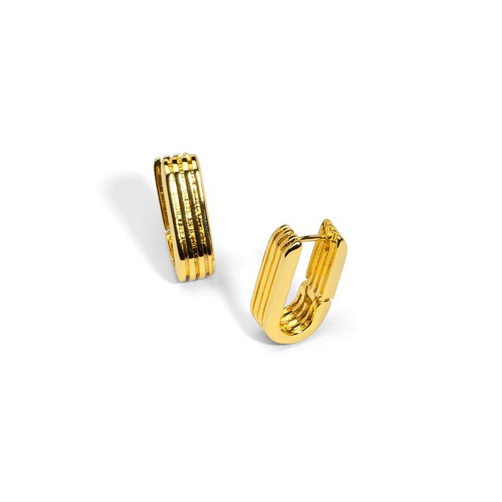 Huggie earring with a ribbed design plated in 18k gold/rhodium.