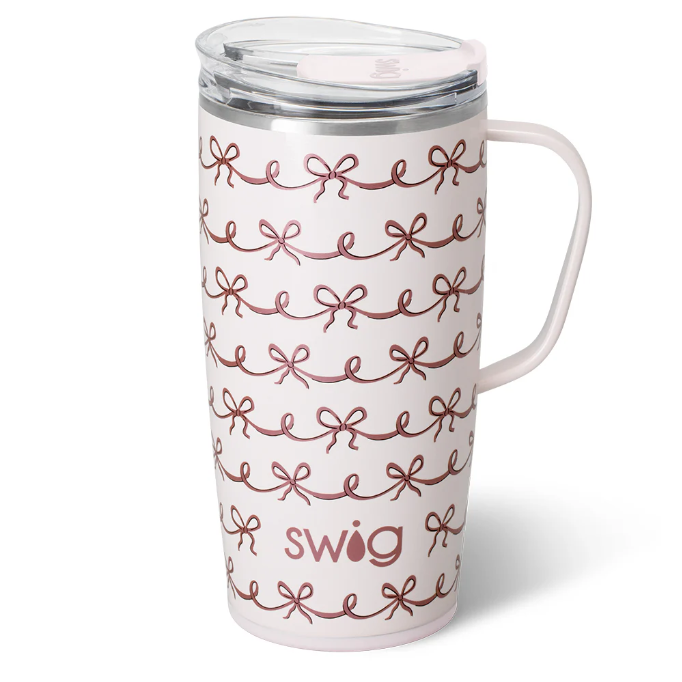 For those who appreciate the classic 18oz Travel Mug but require extra capacity, the Pretty in Pink 22oz Mug offers a perfect solution. Designed with a larger volume and a shape that fits most cup holders, this insulated travel mug keeps your beverage at the ideal temperature throughout your morning commute and beyond. Its expert design ensures convenience and durability for all-day use.