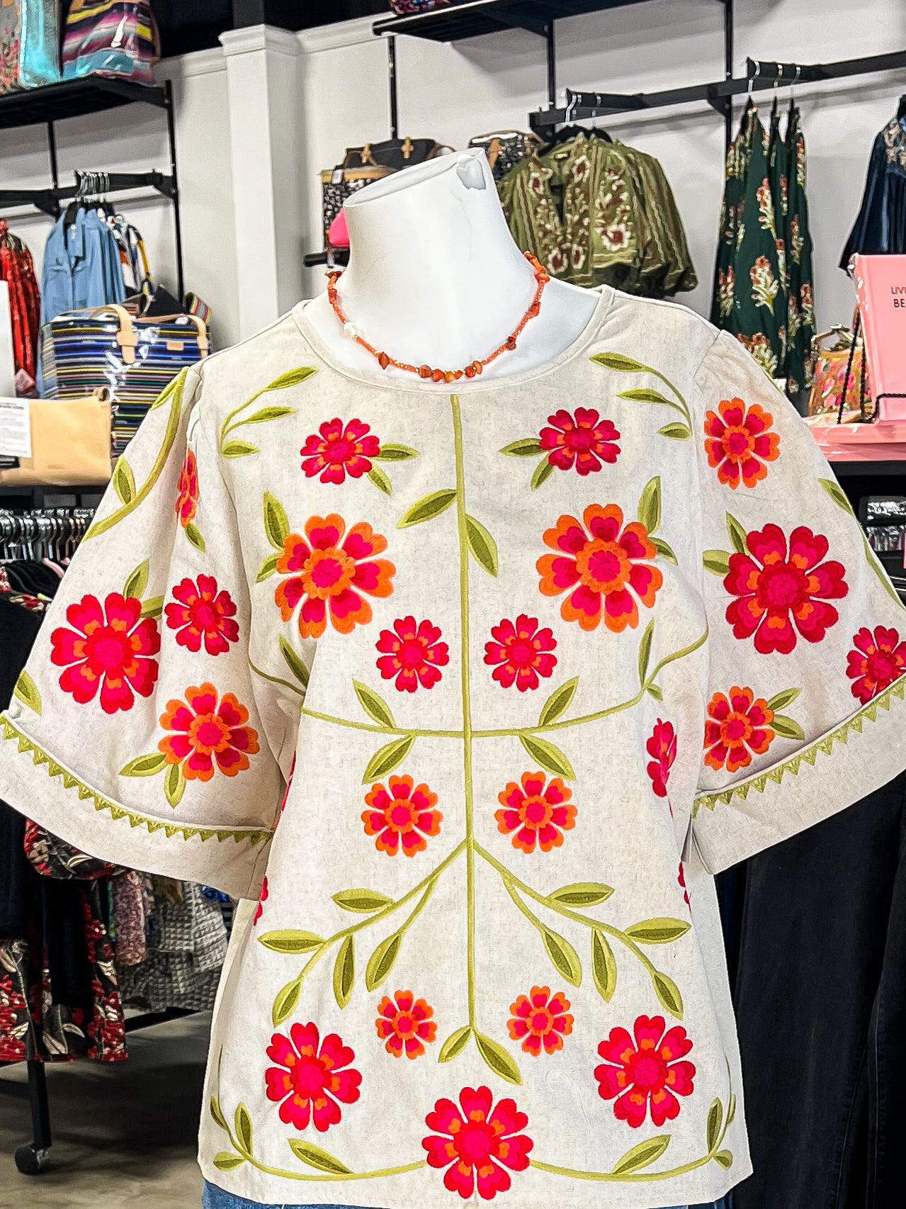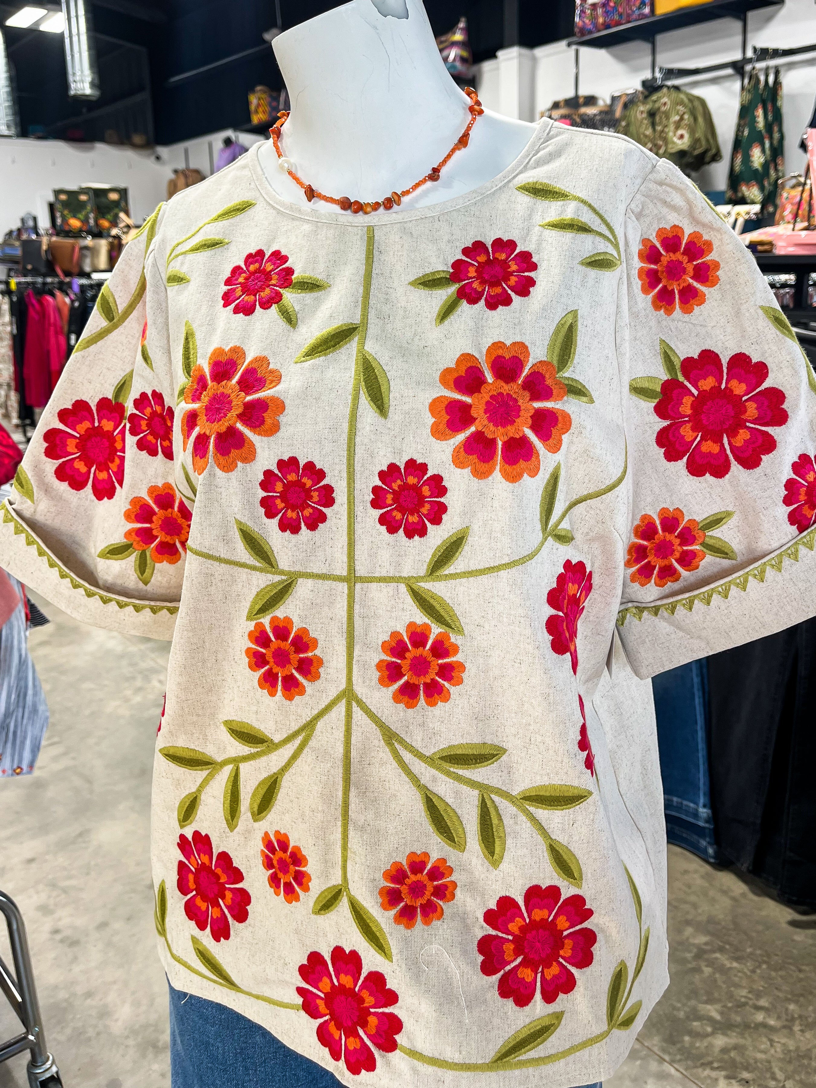Flowers Embroidered on a Classic linen top—yes please! This front of this top is covered from top to bottom with embroidered bright flowers and gorgeous greenery. The sleeves are styled with a permanent rolled tab and zig-zag embroidery. The neckline is closed with a button and keyhole back.