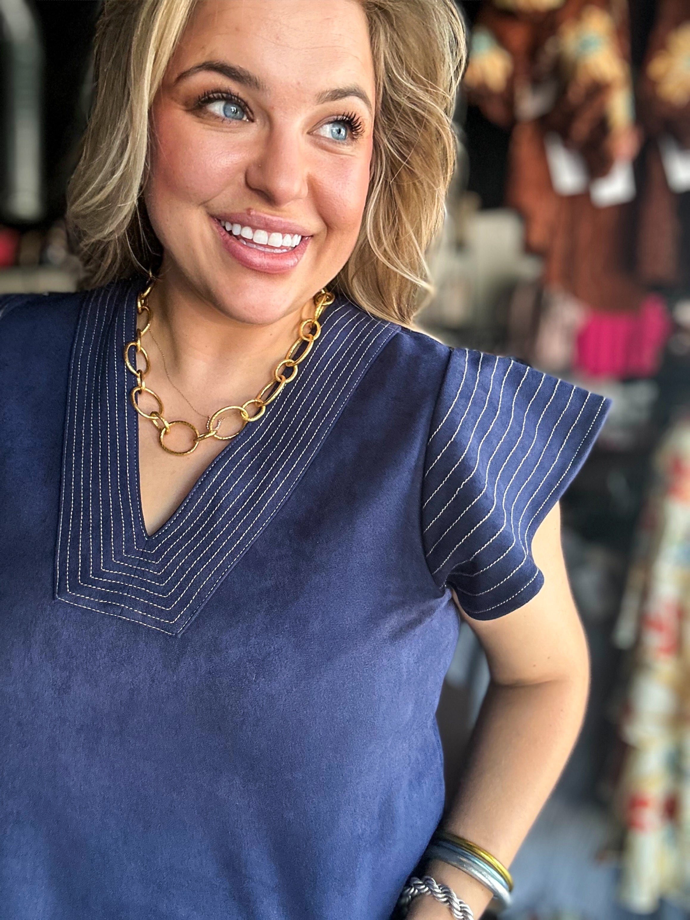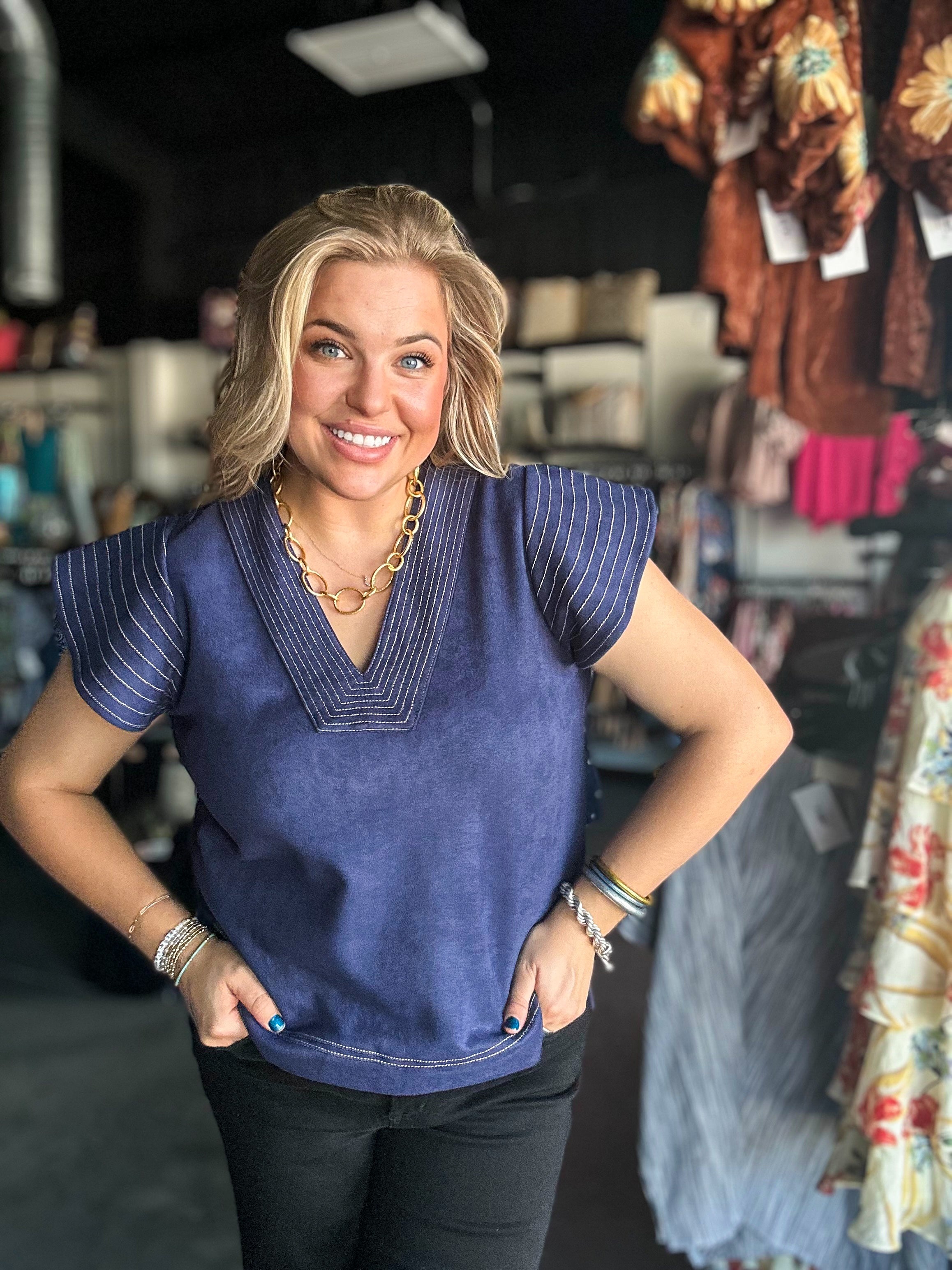 - Why You’ll Love It—easy to wear microsuede flutter sleeve top with detail stitching that can be easily dressed up with a scarf or your favorite earrings.