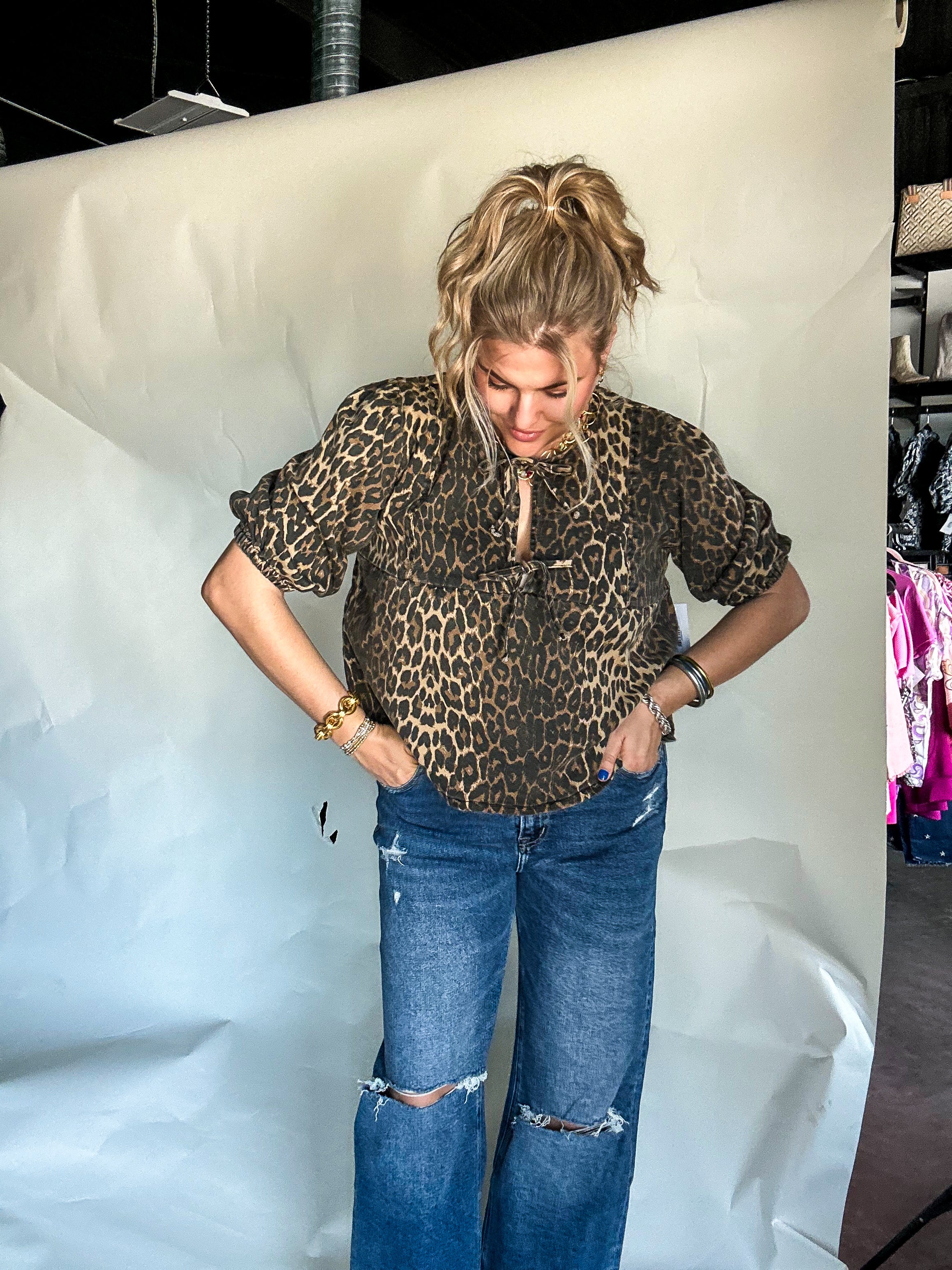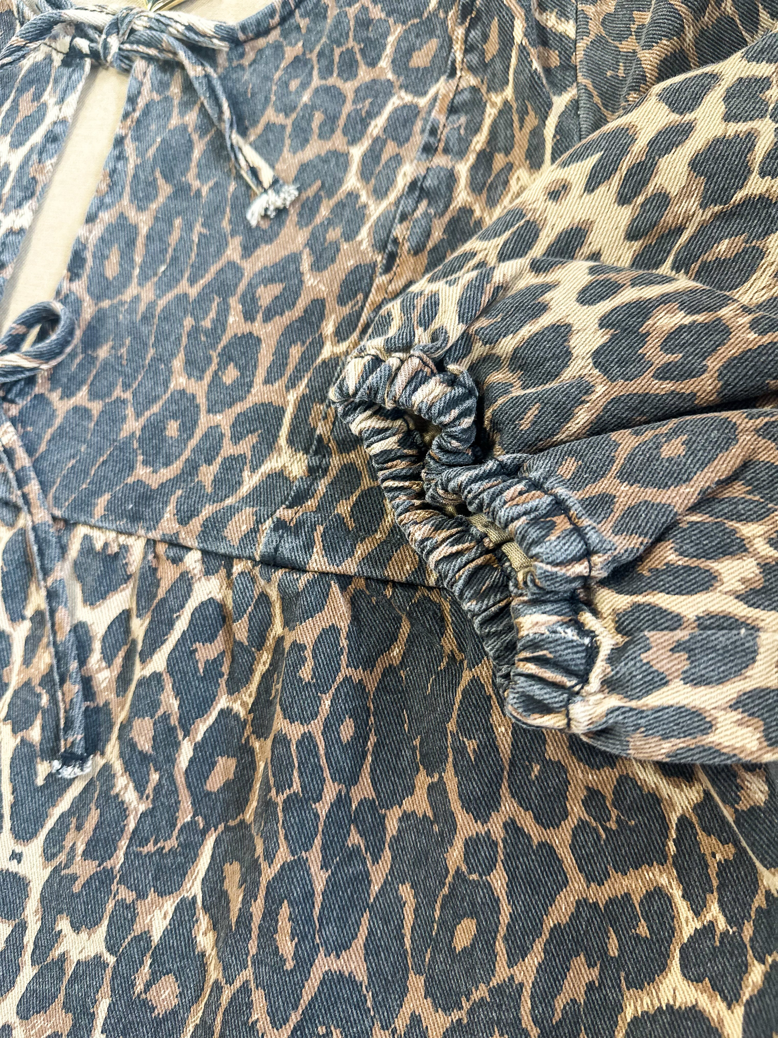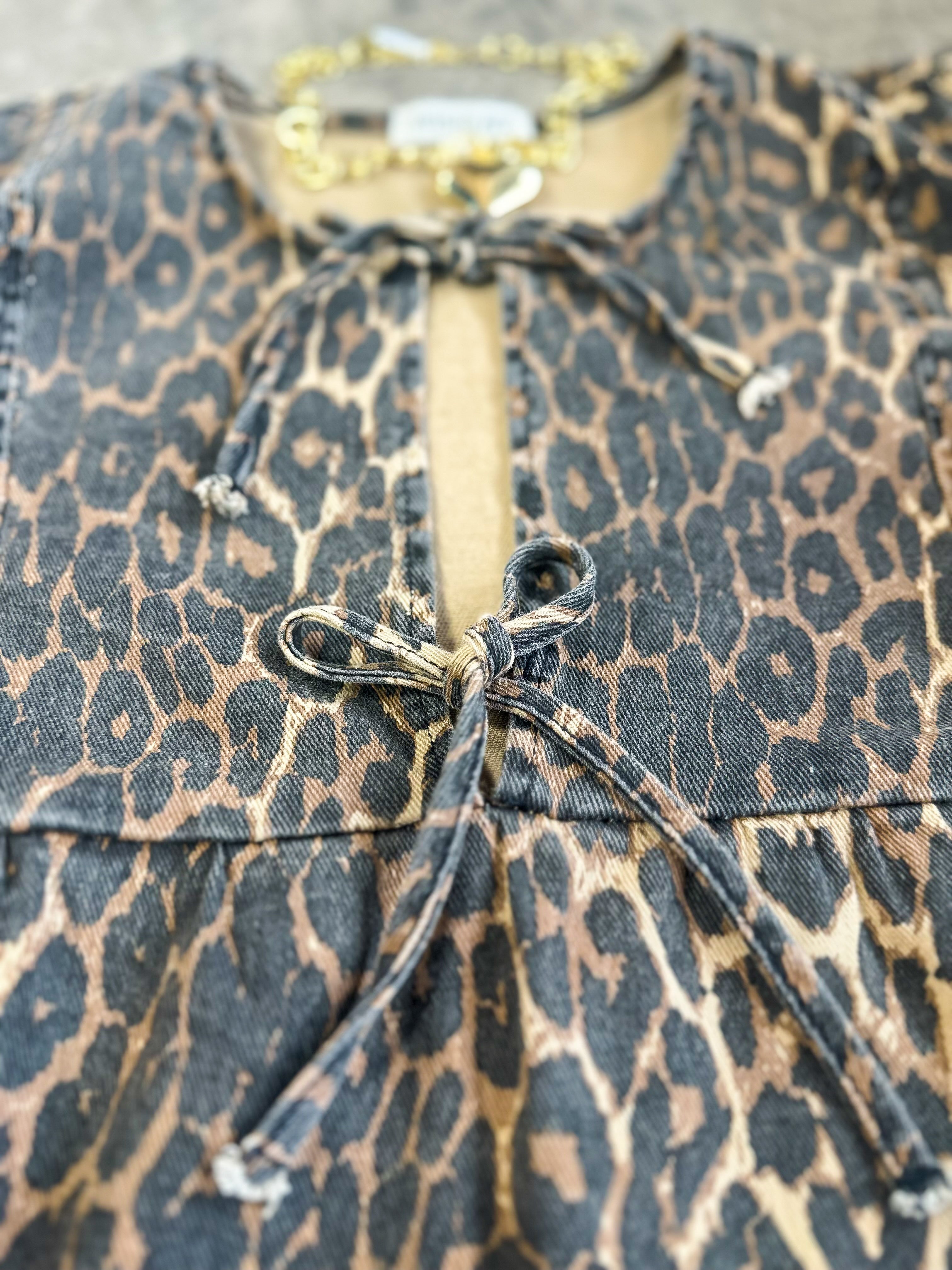Sally’s Leopard Print Top combines classic denim comfort with a bold leopard pattern for a stylish statement. Crafted from 98% cotton and 2% spandex, it offers a soft feel with just the right amount of stretch for ease of movement. The distinctive bow detail adds a refined touch, making this top a versatile choice for both casual and elevated looks.