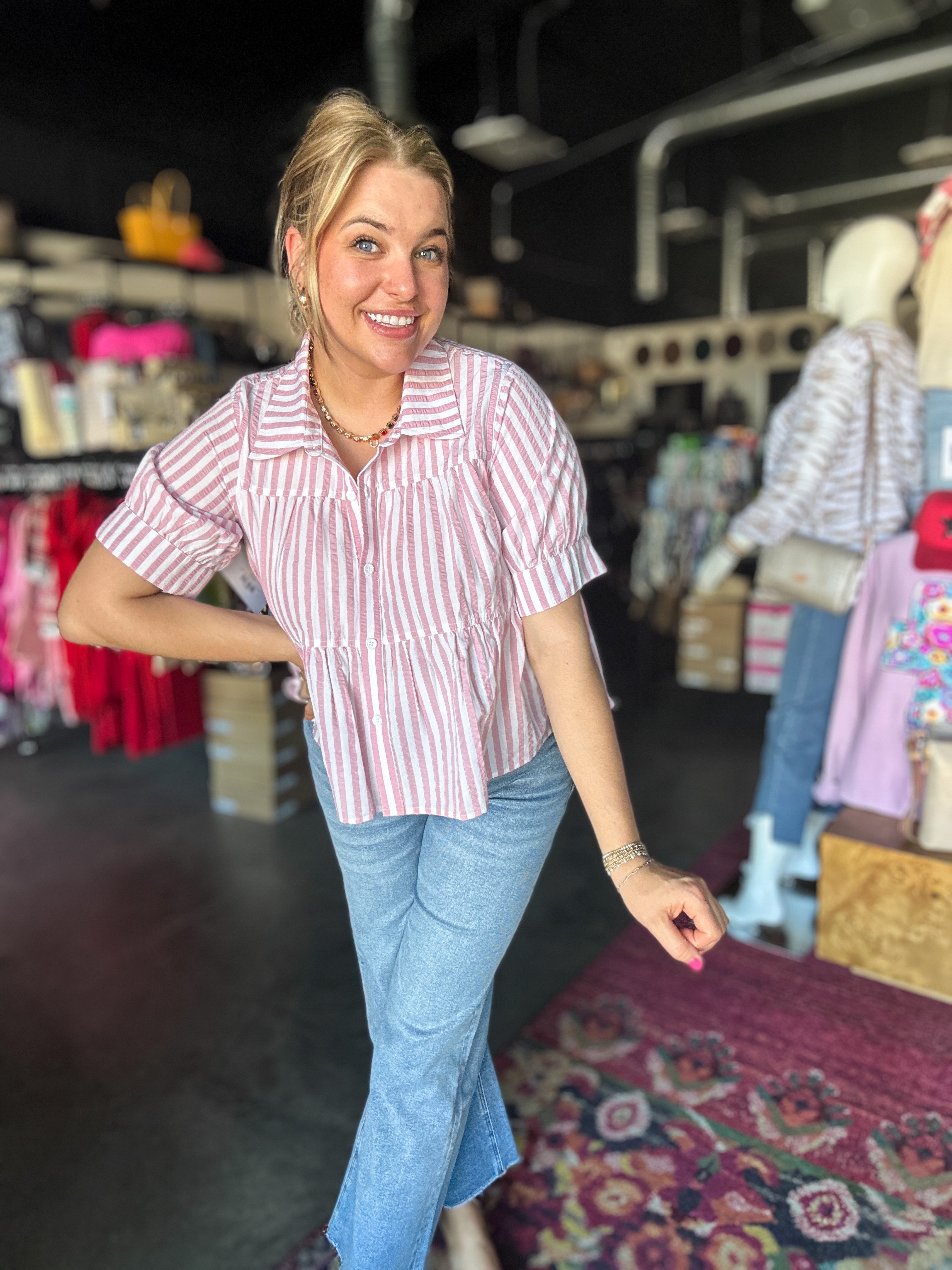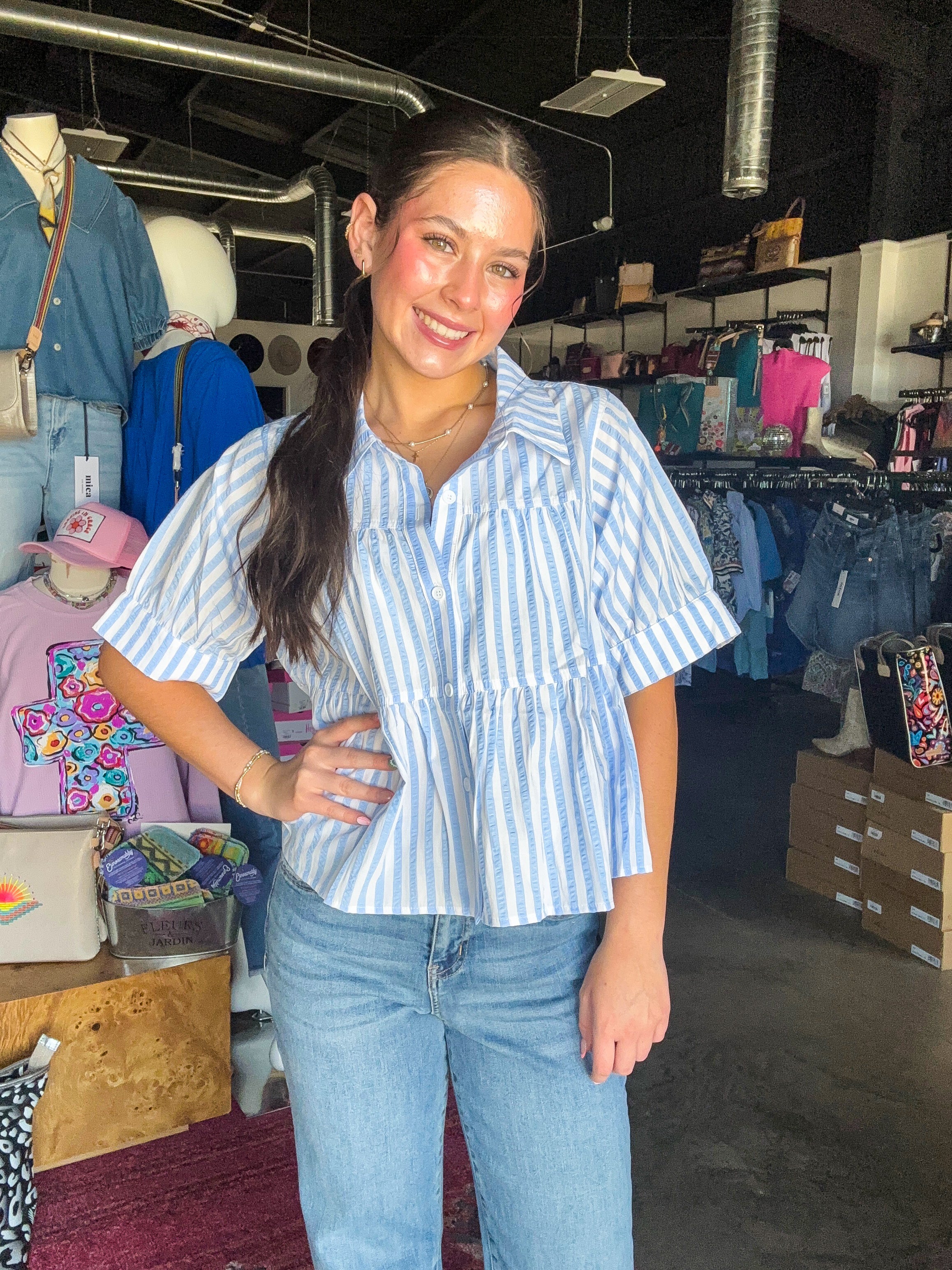 Elevate your wardrobe with our Sassy Stripe Top. Made from a comfortable blend of polyester and cotton, this tiered button-up shirt features functional buttons for added convenience. With a classic striped pattern, this top adds a touch of sophistication to any outfit.