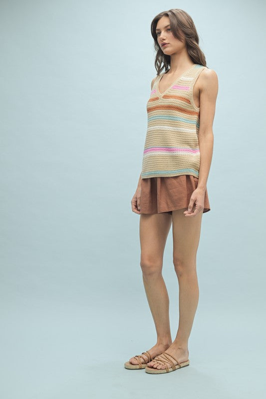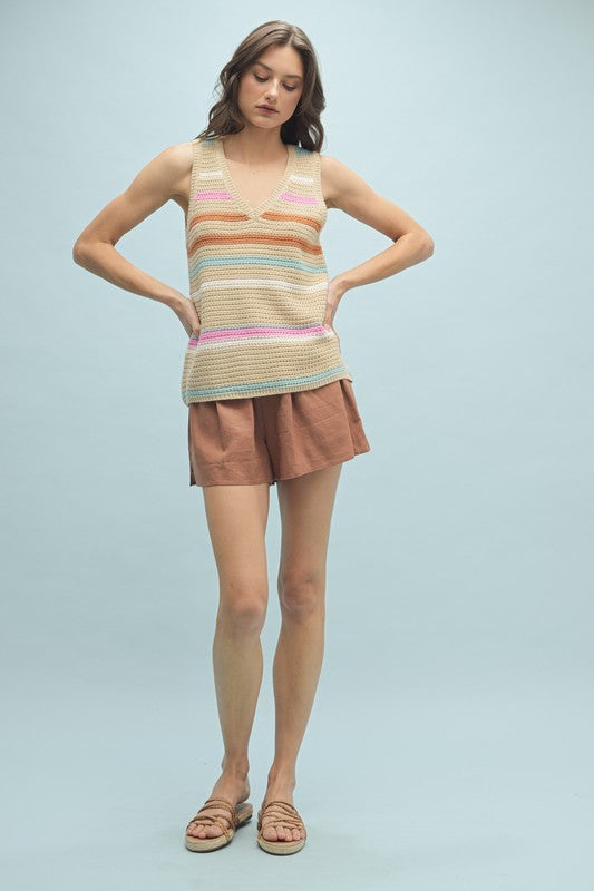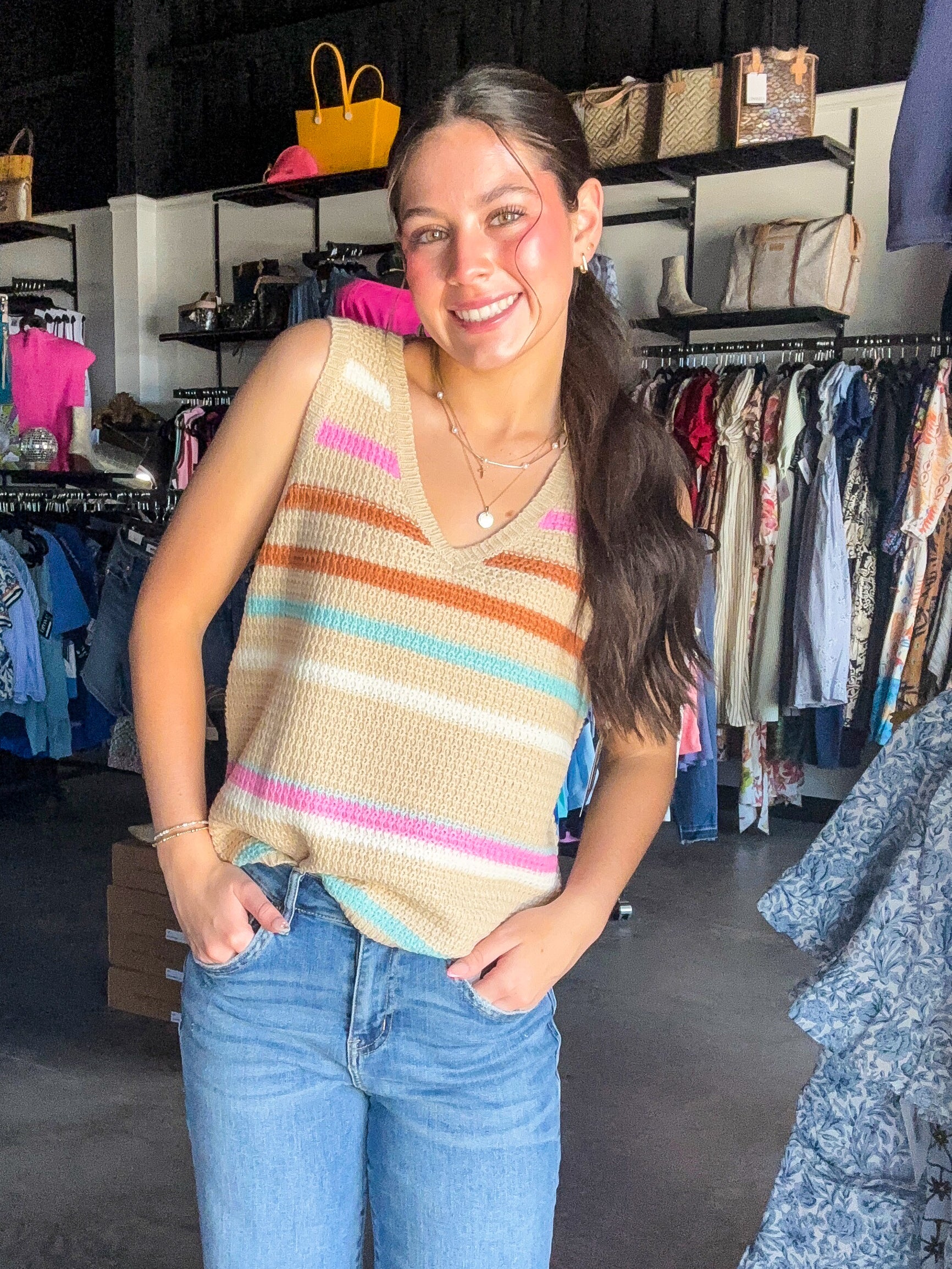 This multi-color striped sweater tank is made from 100% acrylic, providing both comfort and style. The perfect addition to any wardrobe, it will surely make you happy.