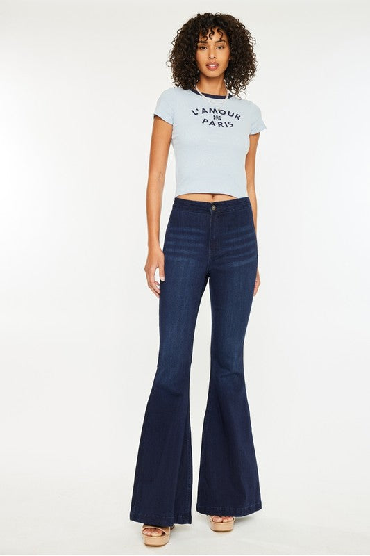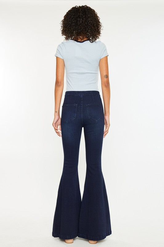 These high-rise super flare jeans offer a sleek silhouette with a comfortable stretch fabric that moves with you. Designed without pockets for a smooth, streamlined look, they feature a regular hem and a classic zipper fly for easy wear. Perfect for those seeking a modern yet timeless denim style with expert tailoring details.